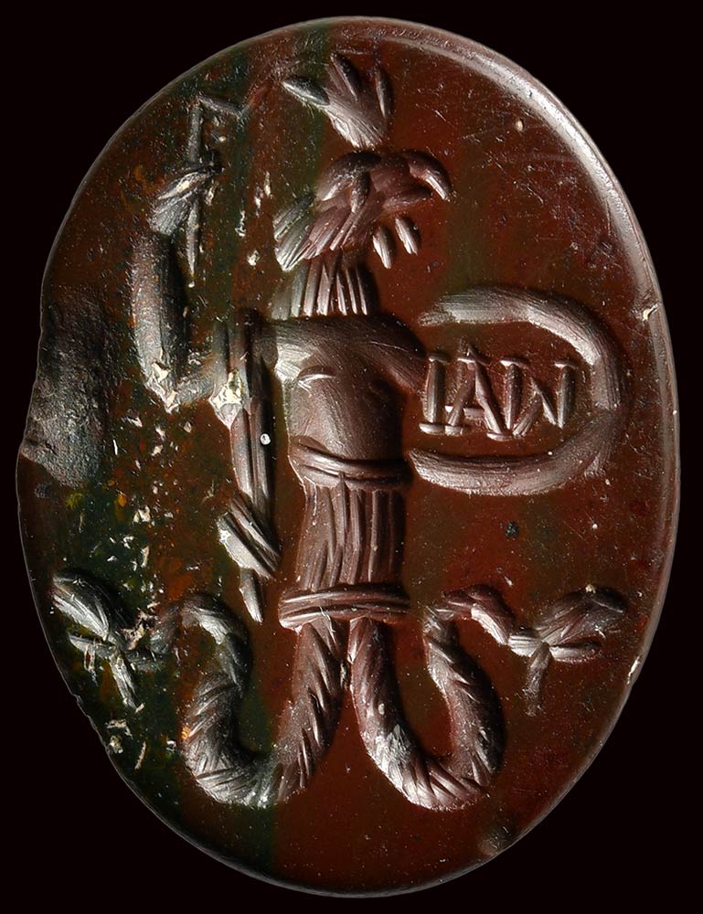 Lot 207 | A roman red jasper with dark green inclusions magical intaglio. Anguipes cock.