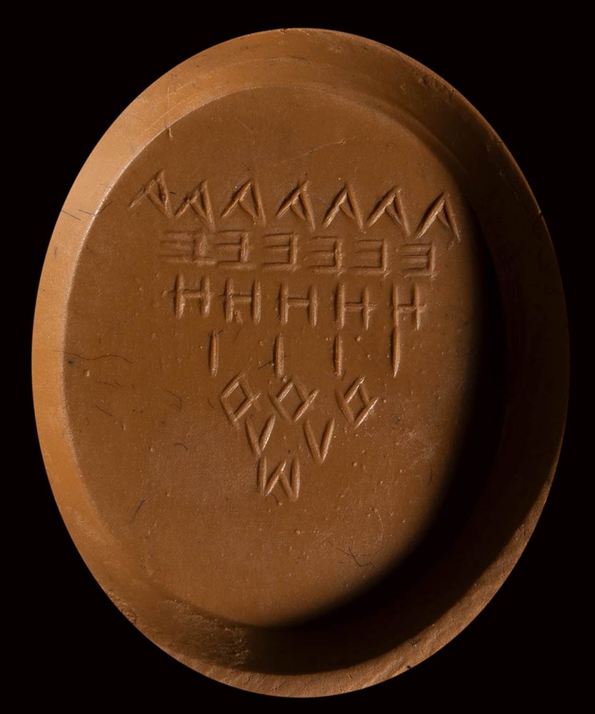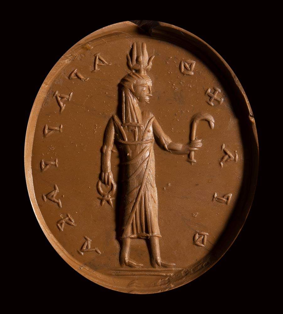 The isiac divinity is faced to the left, wearing a long dress, holding in her right hand a short curved knife, and in her left an instrument. She wears the atef crown with horns, feathers and disc. Around, inscriptions from right to left :