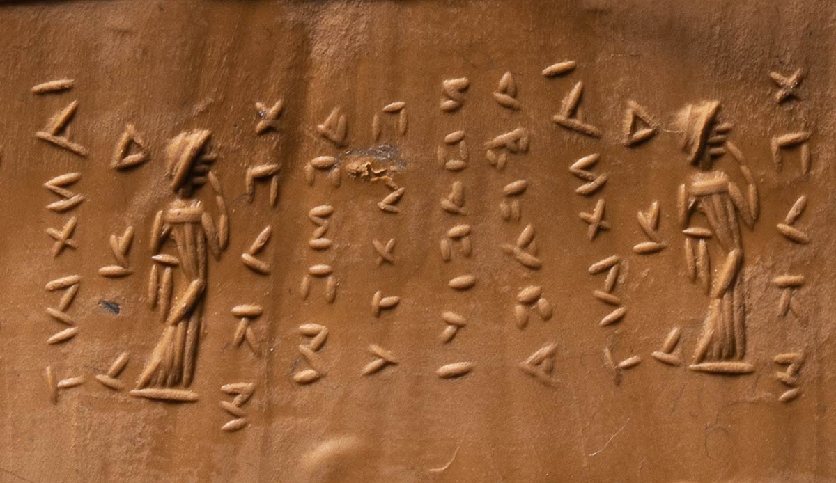 A roman hematite magical fusiform amulet. Feminine figure with inscriptions.