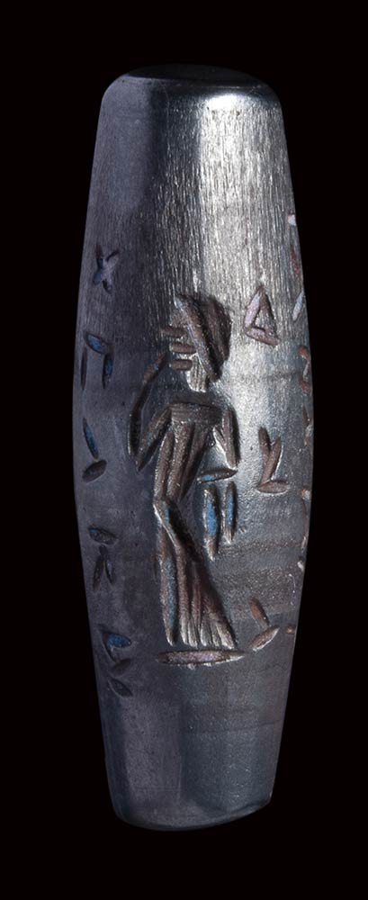 The cylindrical shaped amulet is engraved with a principal feminine figure, dressed with a long dress and hat, turned on the left, her right arm bent and right index to her mouth, meanwhile, she holds her tight with the left arm. Groundline.