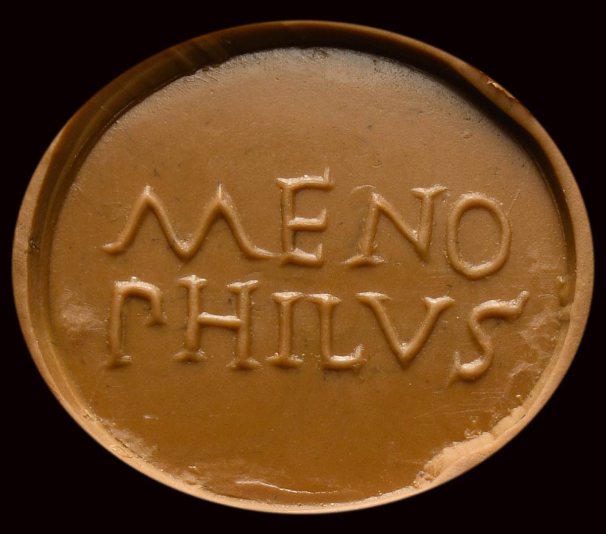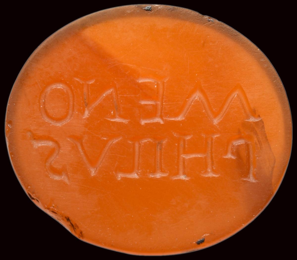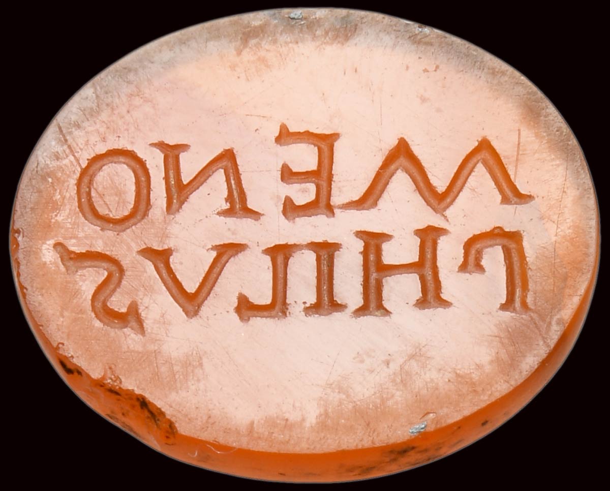 Inscription on two lines (correctly readible on the impression): MENO-PHILVS ("Menophilus"). Personal name referable to the owner of the intaglio. Attractive vivid color of the stone.