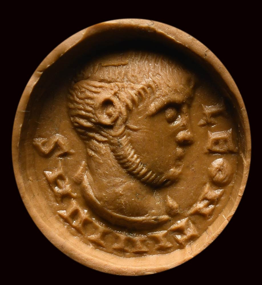 The head is facing left, surrounded by the inscription LEONTI-VIVAS. The effigy is characterized by a short hairflow and a drawn beard, both referable to the imperial models of the late 3rd century A.D. (Massimino Daia, Costanzo Cloro, Massenzio). The inscription contains an auspicious meaning to Leontius. This seal was probably mounted into a ring, traces of which are still on the reverse. Excellent preservation.