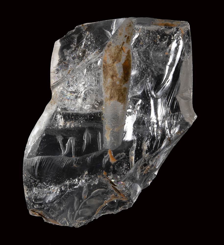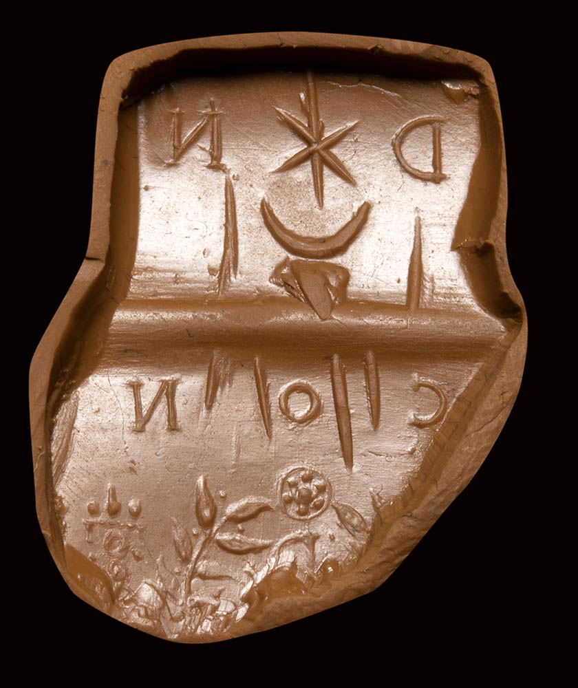 On the front of this fragmentary bulla, a crescent moon with a star flanked by the letters D-N is visible at the top. Below, the inscription C-O-N (identifiable with DN CONSTANTIVS PF AVG ) and below: laurel wreath that converges towards a floral corolla; alongside, military insignia and at the center of the crown there must have been the Christogram, as can be seen from the engraved details still visible. This depiction and the inscription are identifiable in some monetary specimens of the Constantinian Era. The precious pendant, carved in a rock crystal of extraordinary transparency and brightness, has a through hole for vertical fastening, signs of wear and residues encrusted in the marks. Rare.