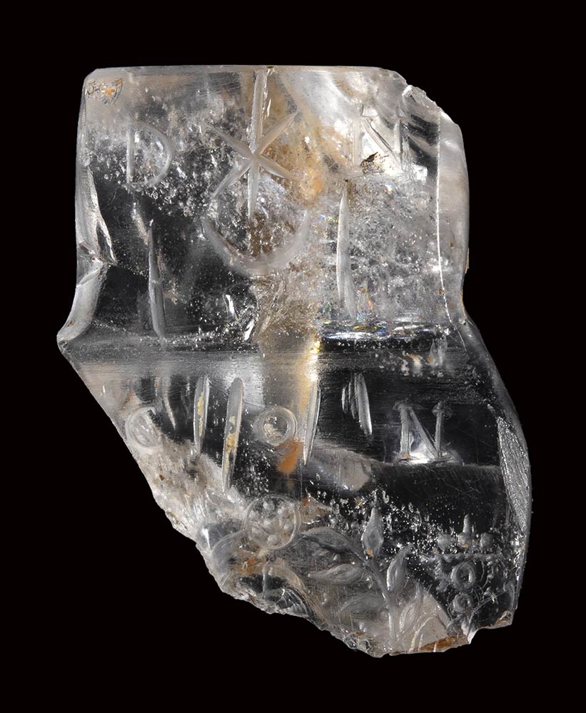 A late roman rock crystal fragment of a bulla. Constantinian inscriptions with emblema.