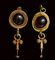Each earring set with garnet cabochon (one damaged) in a gold disc box decorated with twisted gold wires. Supension rings intertwined with a gold twisted pendeloque and granulation. At the terminals, suspension hoops and hooks.