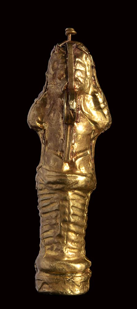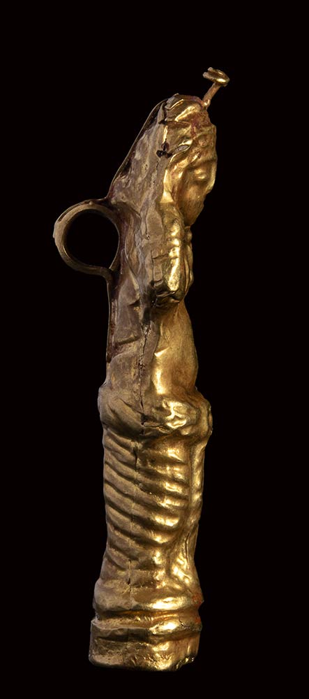 Composing with two embossed layers of gold, this hollow figure represents the goddess with a naked bust, the lower part of the body covered by a folded drapery. She standing on a rounded base.