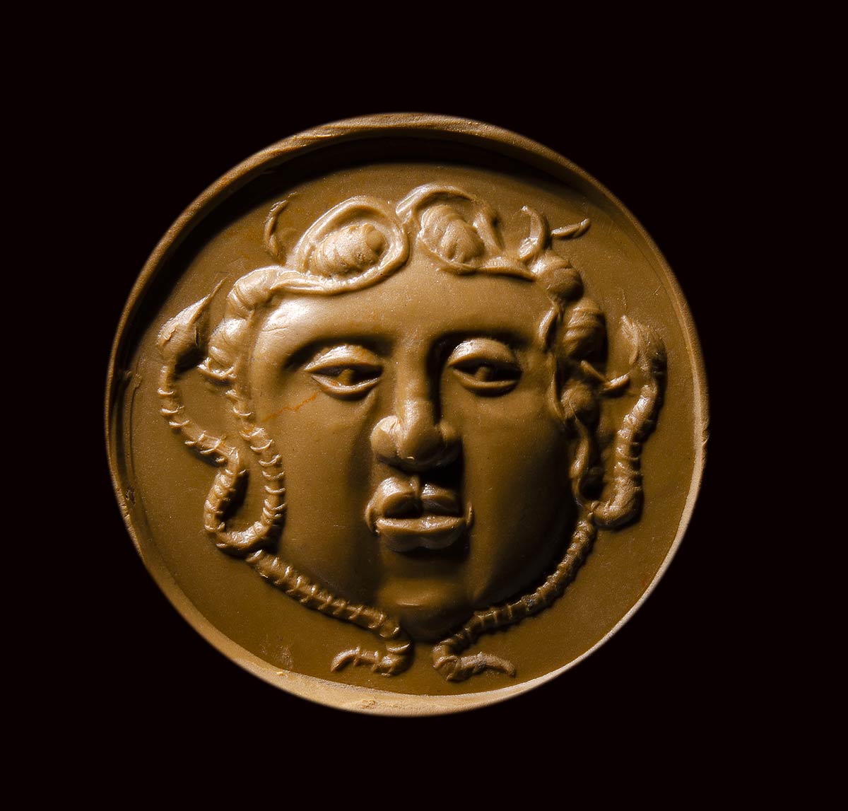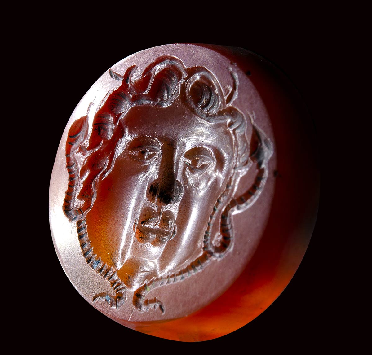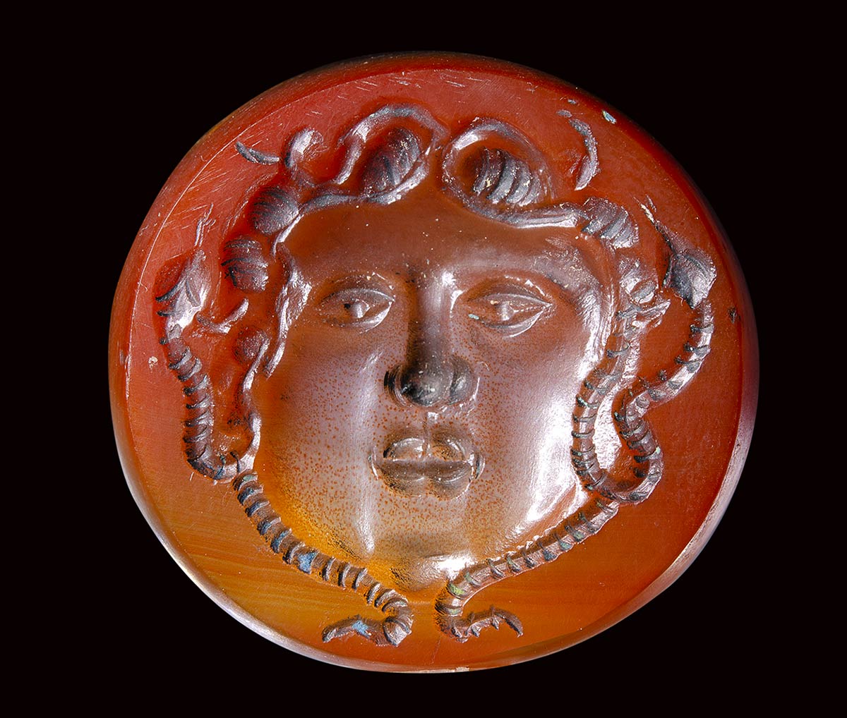 The thick stone is engraved with a Medusa mask characterized by a rounded face with plain chicks, full lips, and a straight little nose. The eyes are framed by heavy lids and the pupils are marked by a globular element. The forehead is surmonted by some curly short locks and snakes surrounding the face until the chin. This unusual stone is characterized by certain stylistic, iconographic and executive details that place it in the glyptic production referable to the court of Frederick II Hohenstaufen. The cameo production is better known, while the intaglio production is still little known and rare. The frontal face of this Medusa certainly emulates the classical models of the Greek-Roman Era, but reveals its evolution through the models of late antiquity with new stylistic features belonging to the early medieval age. The shape, the choice of this variety of agate (slight burnt on the back side) and the type of polishing seem to confirm this dating and the geographical area of its production (southern italian ateliers). The choice of a mythological subject inspired by classical antiquity is in line with the Federician cultural project, always maintaining its apotropaic meaning. The stone was mounted probably in a pendant.
