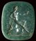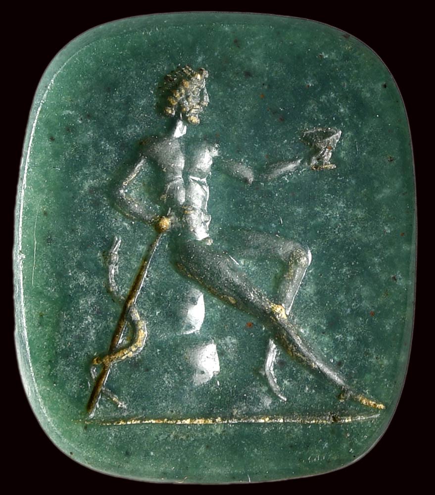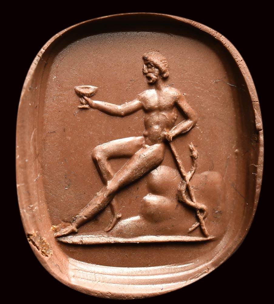 The naked deity is seated on the rocks, holding a cup and the scepter with entertwined snake. Groundline. Attractive color of the stone. Postclassical work.