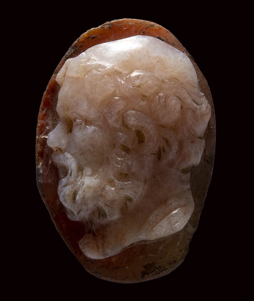 The bearded character is turned to the left, wearing the ivy crown. Wear marks and chippings on the edge. Probably an ancient cameo slightly reworked in postclassical times.