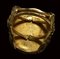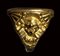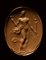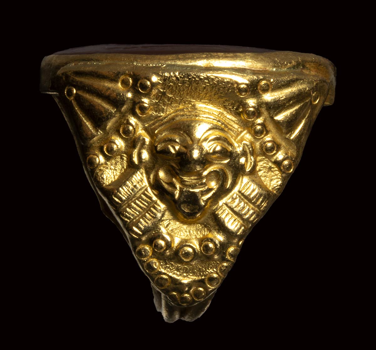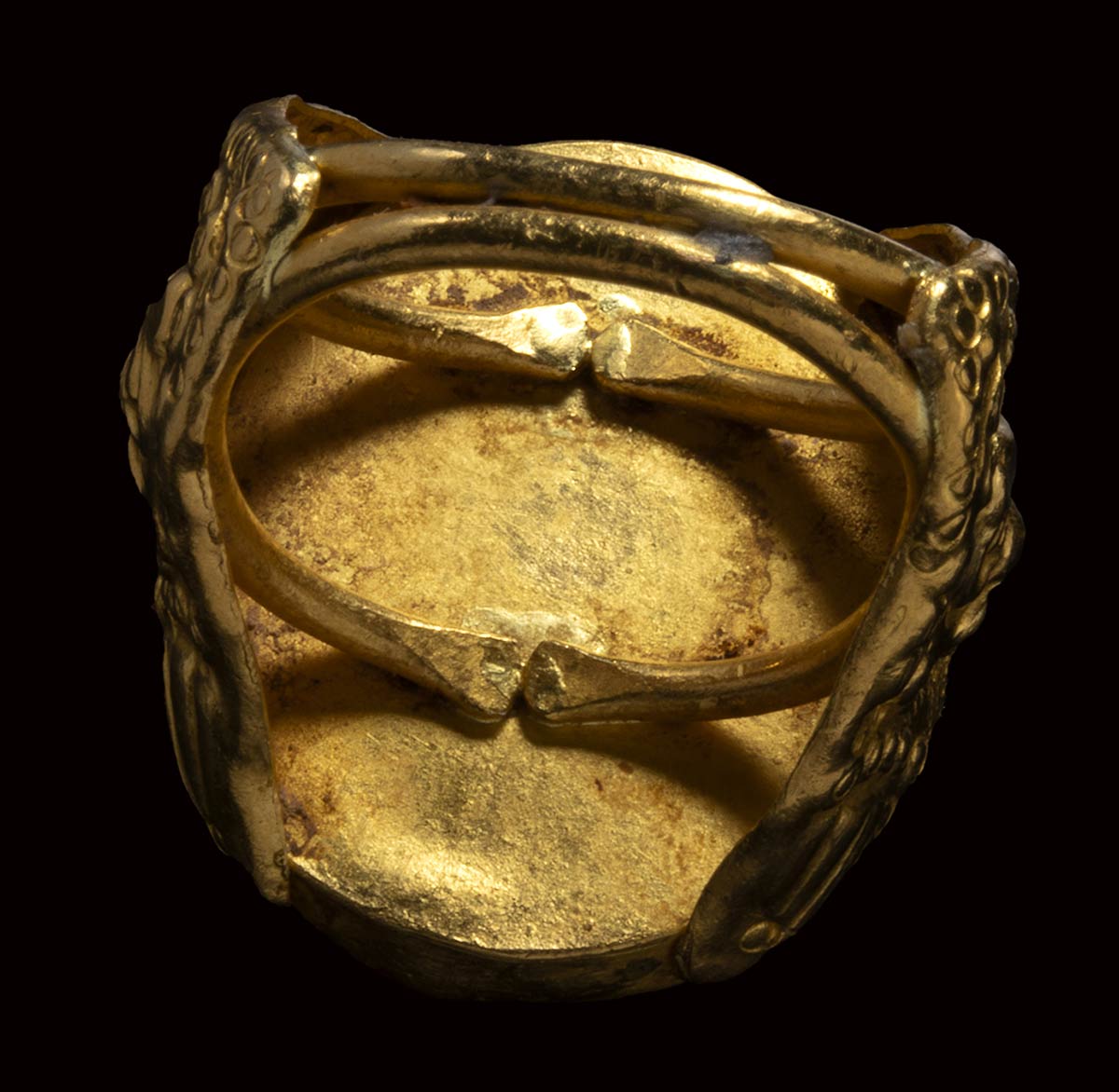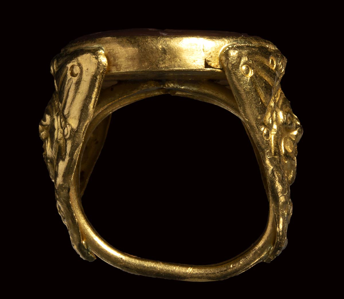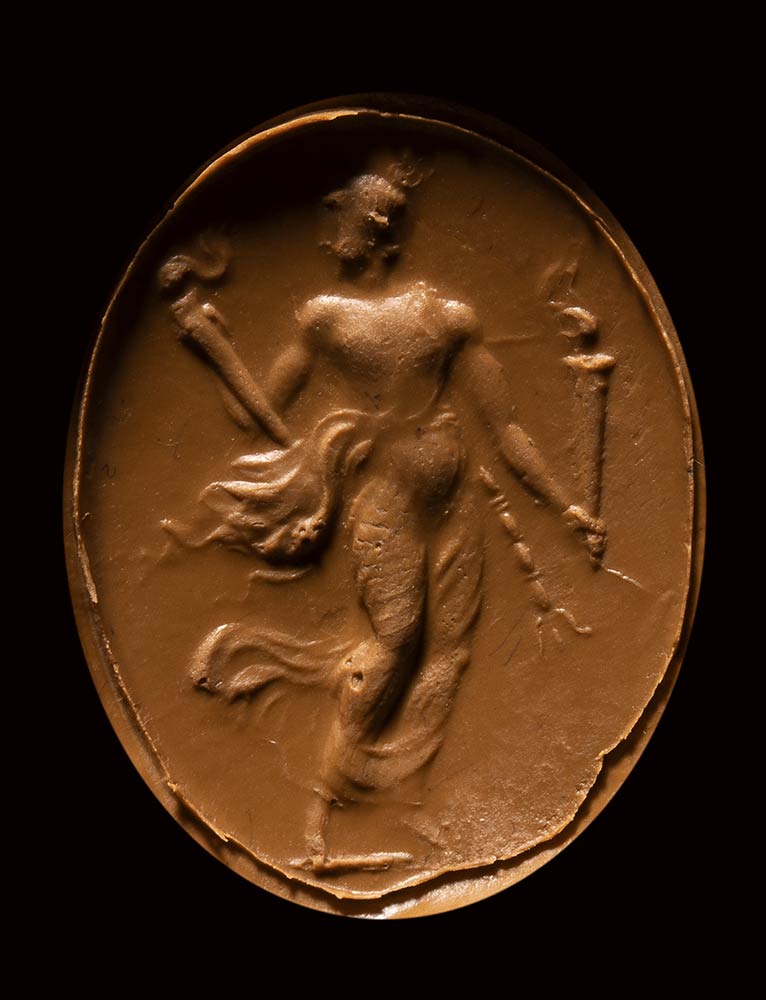 The female figure advances to the left, turning her head in profile backwards to the right. She wears a tunic that adheres to the body for the wind, which also raises a veil. With both hands she holds burning torches. Allegorical subject (perhaps referred to Diana Lucifera), probably executed in the post classical era. Signs of wear. The gem is mounted in an Etruscan style setting, adorned with two gorgona masks chiseled on the triangular shoulders of the ring. Fine condition.