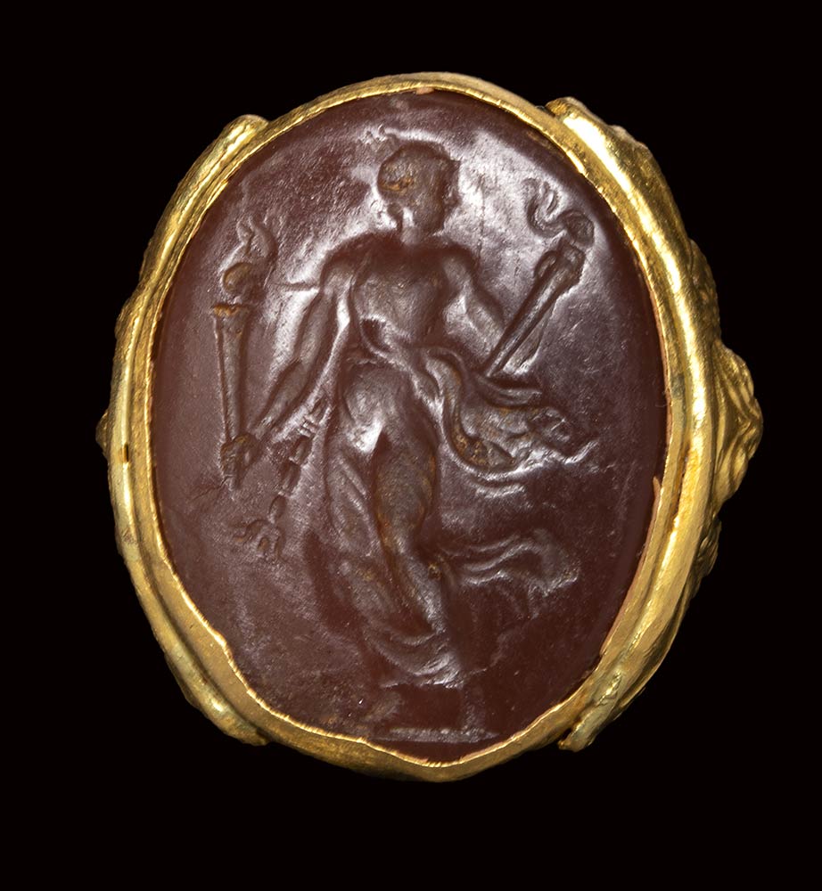 A postclassical carnelian intaglio set in a gold revival ring. Female figure with torch.