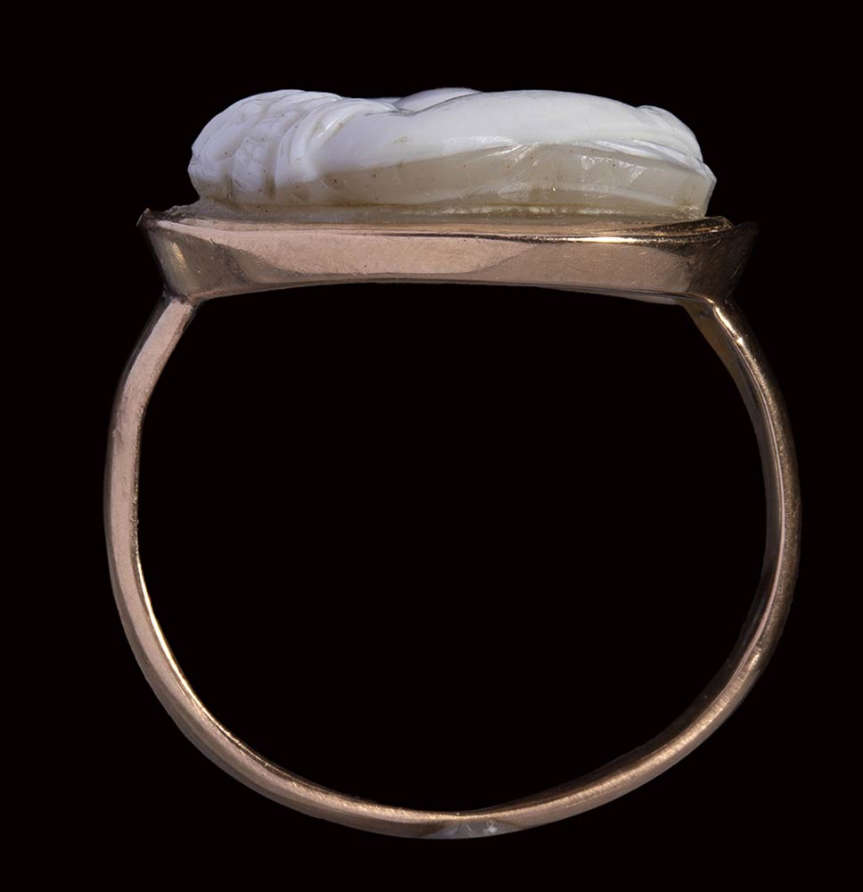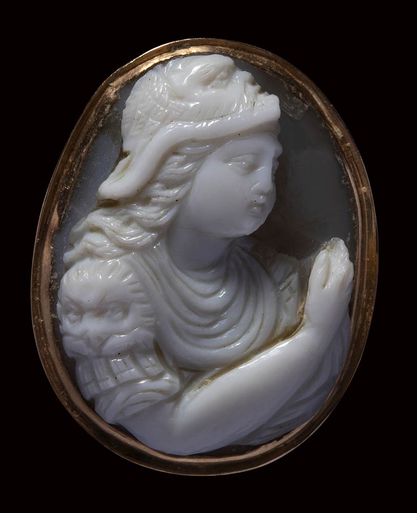 The goddess is wearing an armor with a cloack; a mask on her helmet; an expressive grotesque - lion head as epaulette. The character is facing right, with a raised arm and with the face turned in three quarter. This fine cameo is engraved in high relief in the typical renaissance taste. Slight chips, cracks and wear marks on the edge. The stone is set in a gold ring.