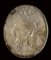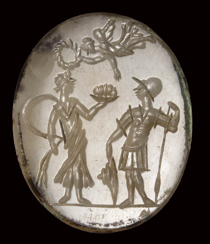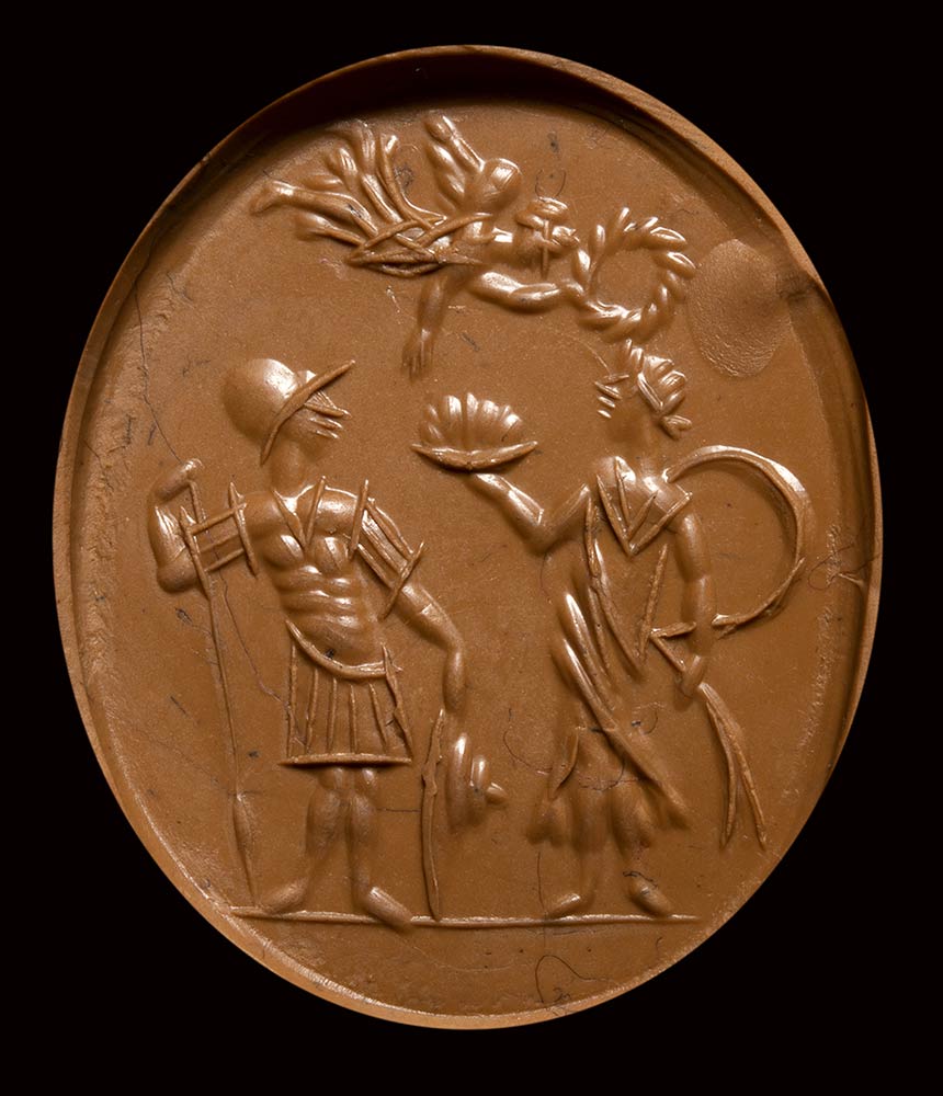 On the left, a draped female figure in the act of offering a tray with offerings; on the right, an helmeted warrior with spear and shield. Above, a winged victory in the act of crowning the offerer with a laurel wreath. Ground line. Allegorical scene. North Italy-Cisalpine atelier.
