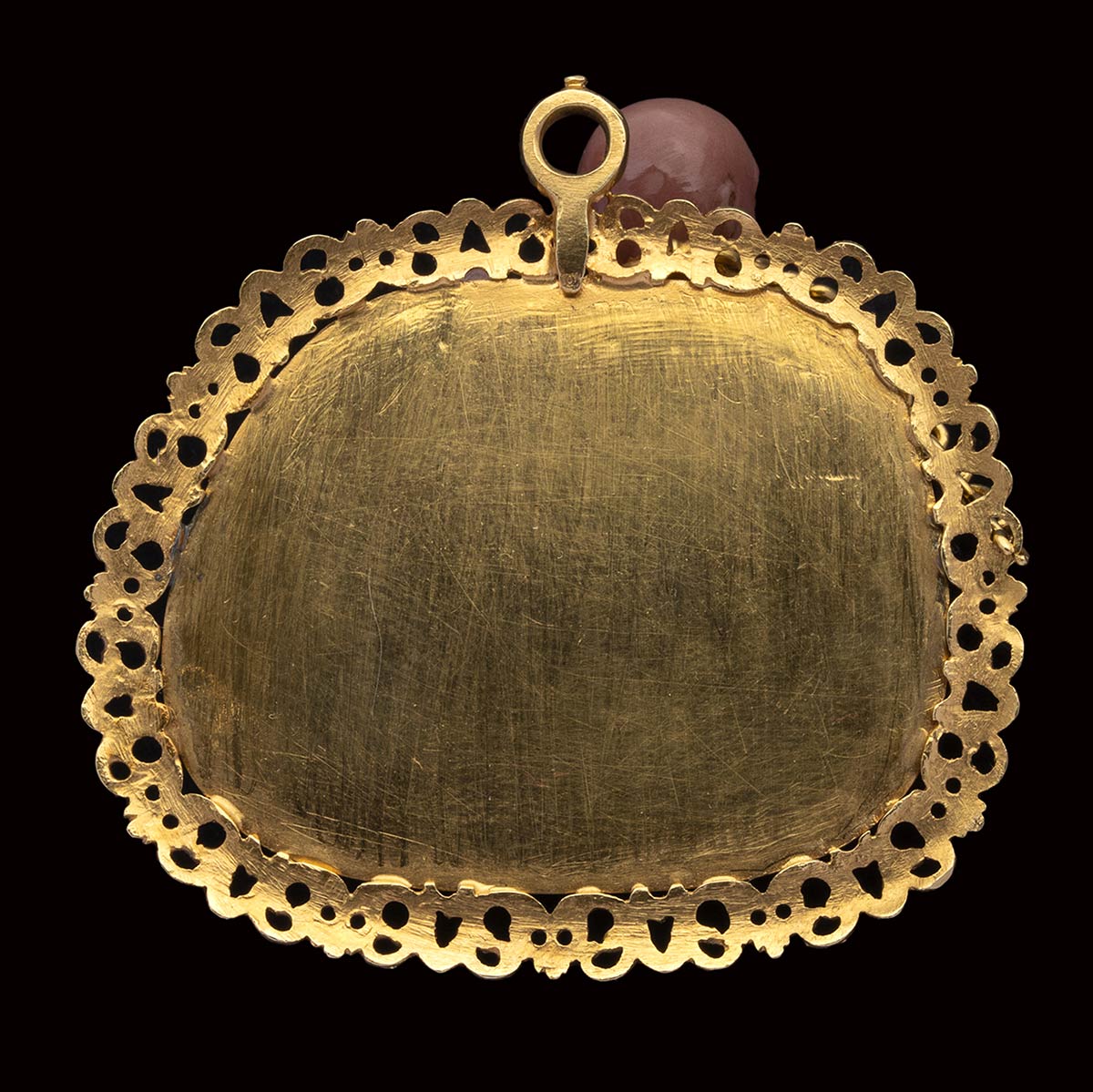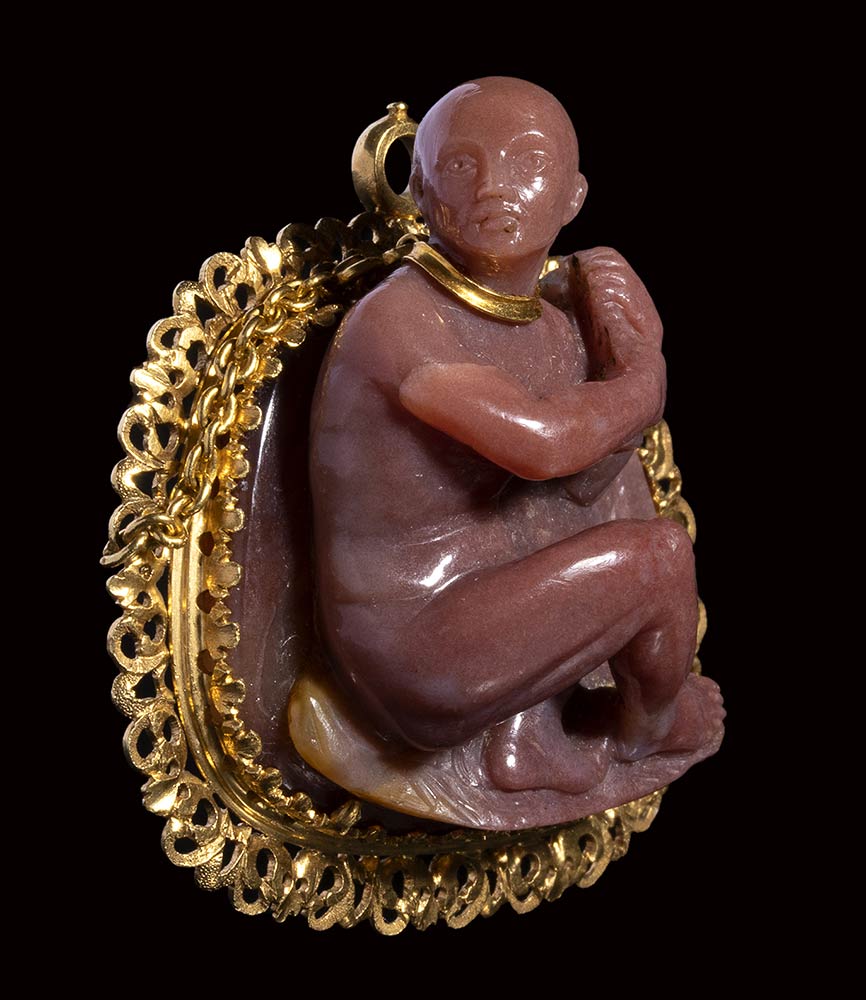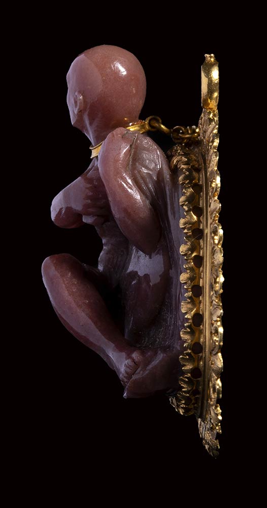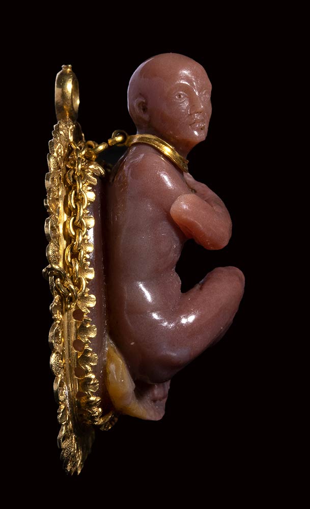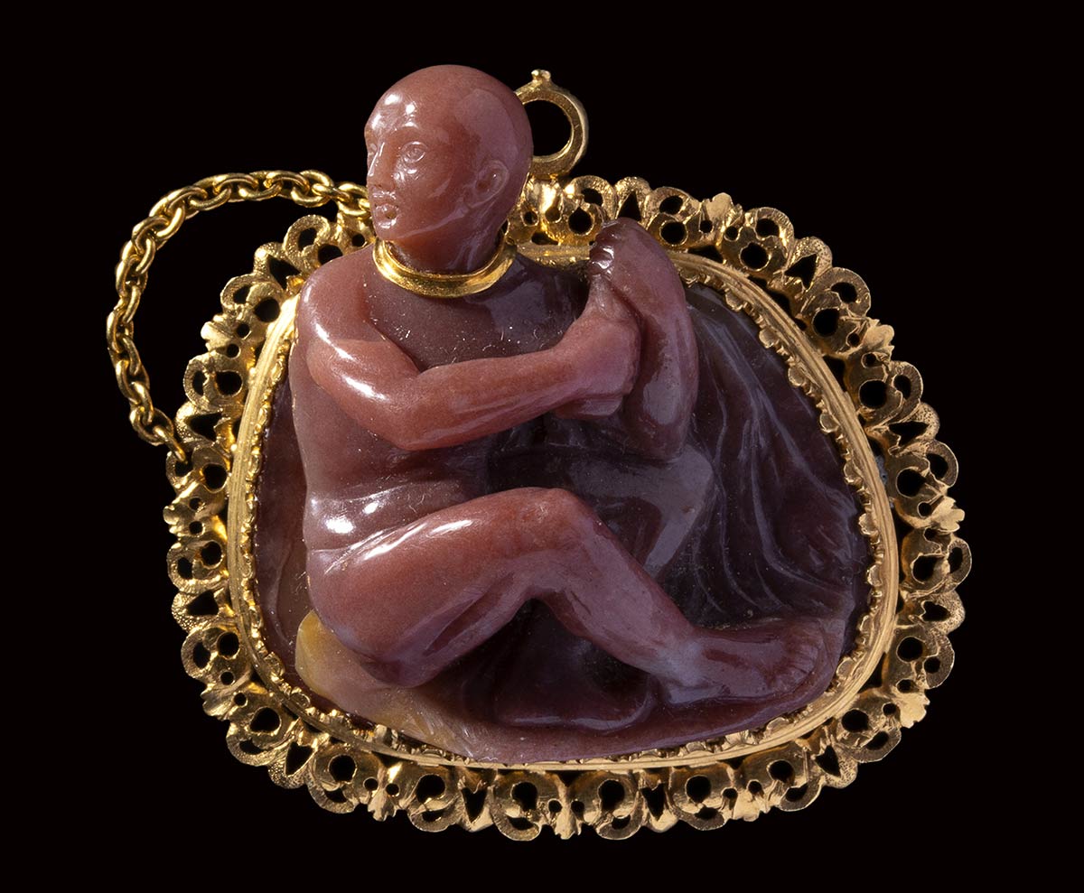 This extremely refined and beautiful jewel is extraordinary for the quality of its composition and execution. Masterfully carved, it represents a chained captive (his bald head indicating that he is of Oriental origin, probably Ottoman or North African). This masterpiece is very close with works by the celebrated hardstone carver Giovanni Ambrogio Miseroni, who worked alongside his brother, the Imperial stone-cutter Ottavio Miseroni. The choice of the stone, the quality of the mirror polishing technique, the facial and the anatomical features of the figure (incised eyes), the composition are all important elements to compare with Miseroni’s works as the Statuette of a Reclining Venus with Cupid in the Kunsthistorisches Museum, Vienna (inv. no. KK 1730). The way the figures emerge from the stone, flanked by flowing drapery, is similar to the present cameo. The gold mount and chain resemble those from a small scent flask from the same circle. The iconography of the shackled prisoner is evident both in Classical and in Renaissance art. Compare, for example, with Giulio Romano’s Chained prisoners, also shackled at the neckfrom the Palazzo Te in Mantua (circa 1527-1528). However this jewel seems to have a meaning that goes beyond technical virtuosity, fashion for certain subjects or political allegory. An allegory rather referred to carnal love.