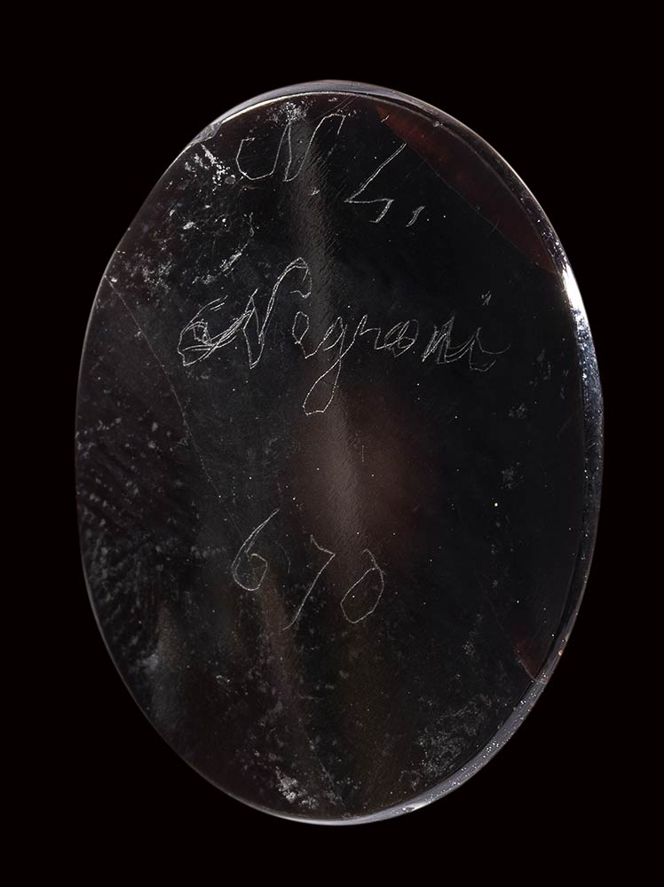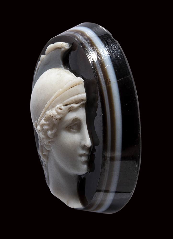 The helmated deity is facing right. On the reverse of the stone, an engraved handwritten inscription: “N. 4 - Negroni - 670”. Fine work executed on an attractive six-layers agate. Mirror polishing. Slight chipping on the helmet crest.