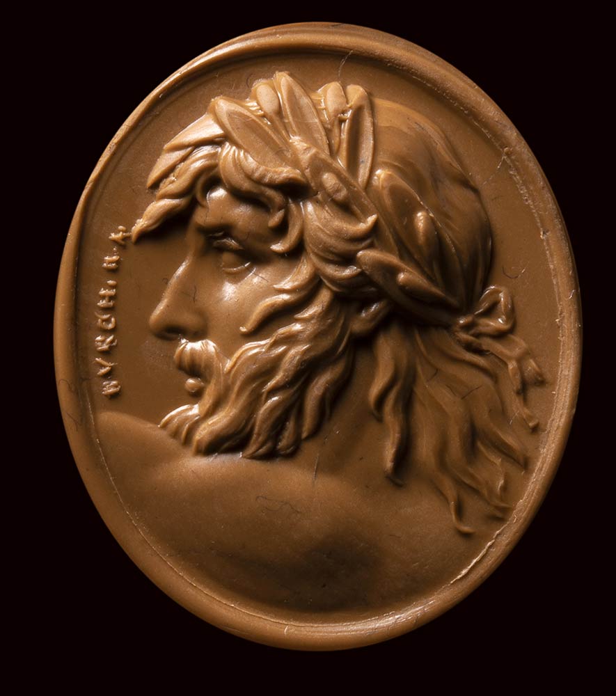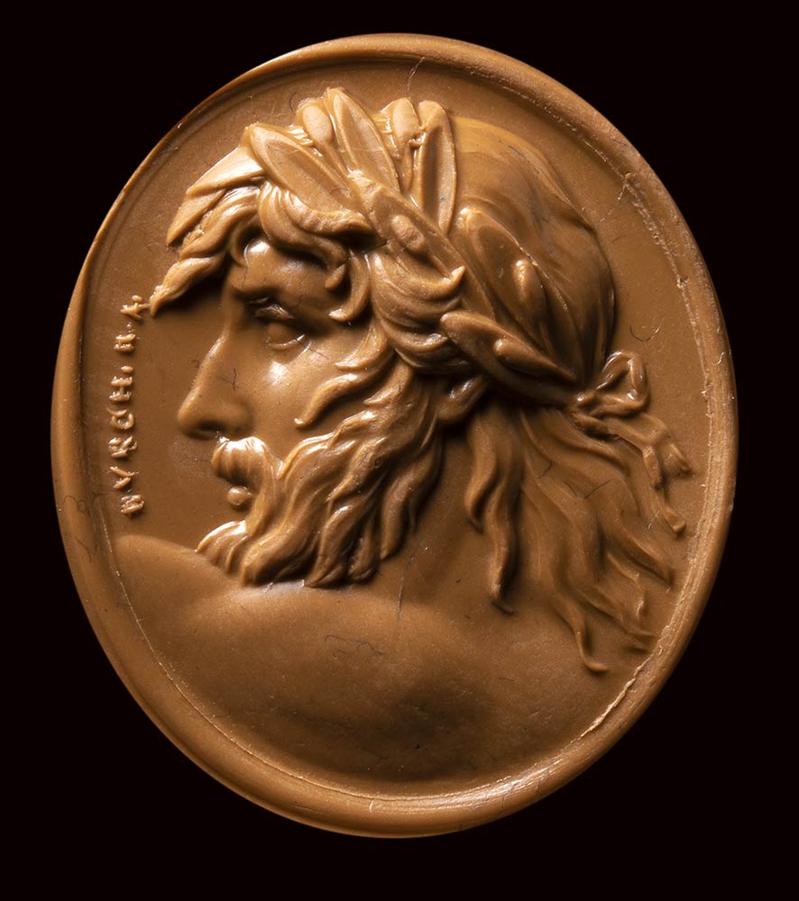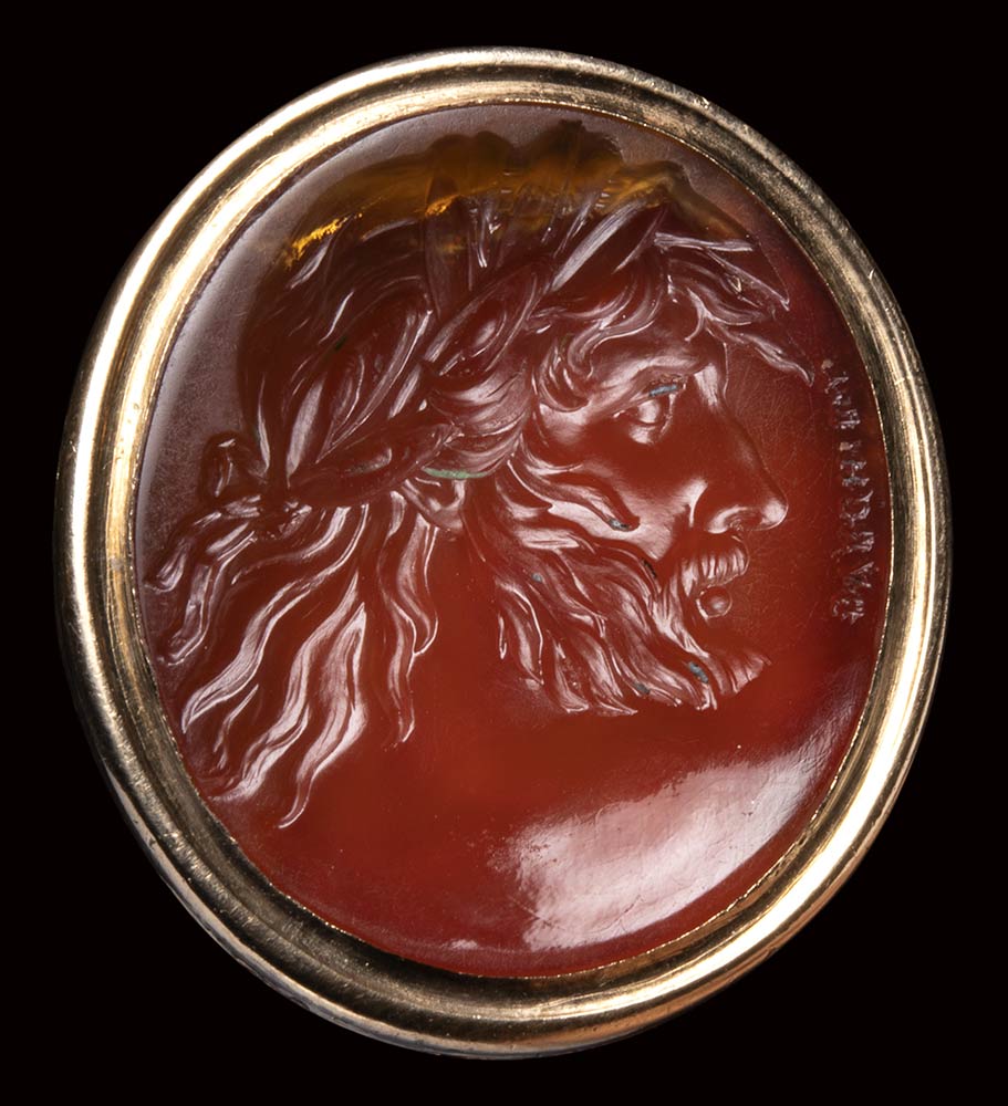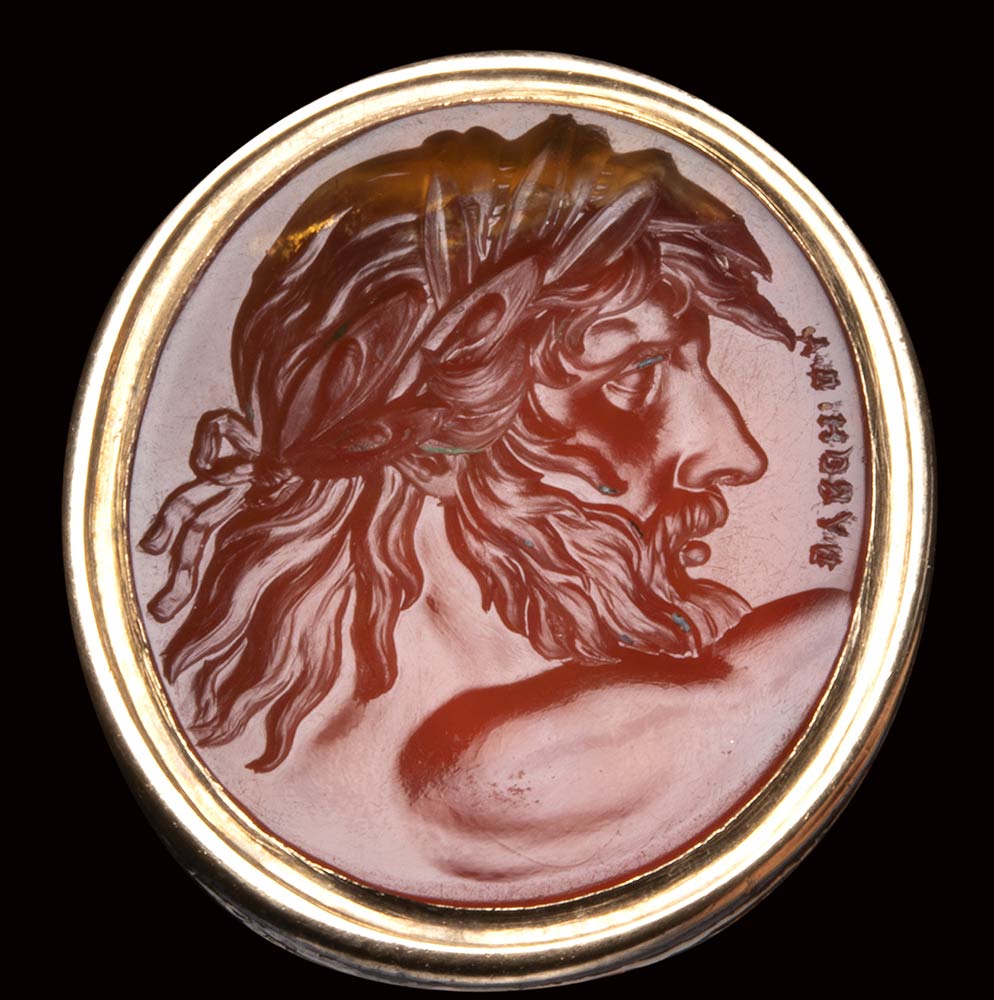 A fine carnelian intaglio seal engraved by Edward Burch. Zeus wearing a laurel wreath.