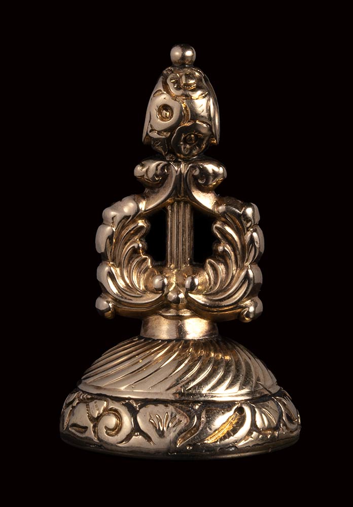 This beautiful intaglio is signed BURCH R.A.: opus of Edward Burch (1730-1814) from Royal Academy. The artist is considered one of the England’s greatest gem-engravers. This stone is mounted as an early 19th century seal engraved with a border of shells, the handle modelled as a stylised lyre composed of foliate scrolls. A very fine intaglio executed with great skill. Light crack on the stone. Extremely fine mirror polishing.