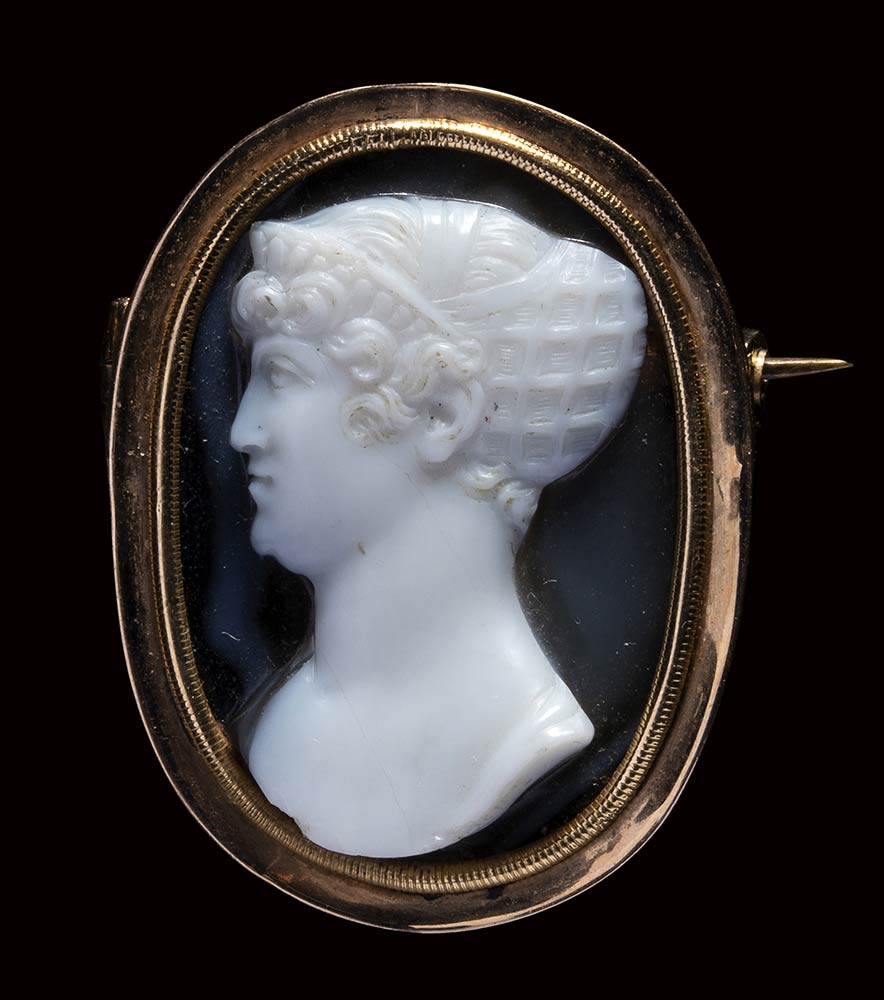 A late Georgian gold brooch set with an onyx cameo portrait by Berini. Bust of a noblewoman.
