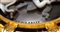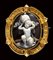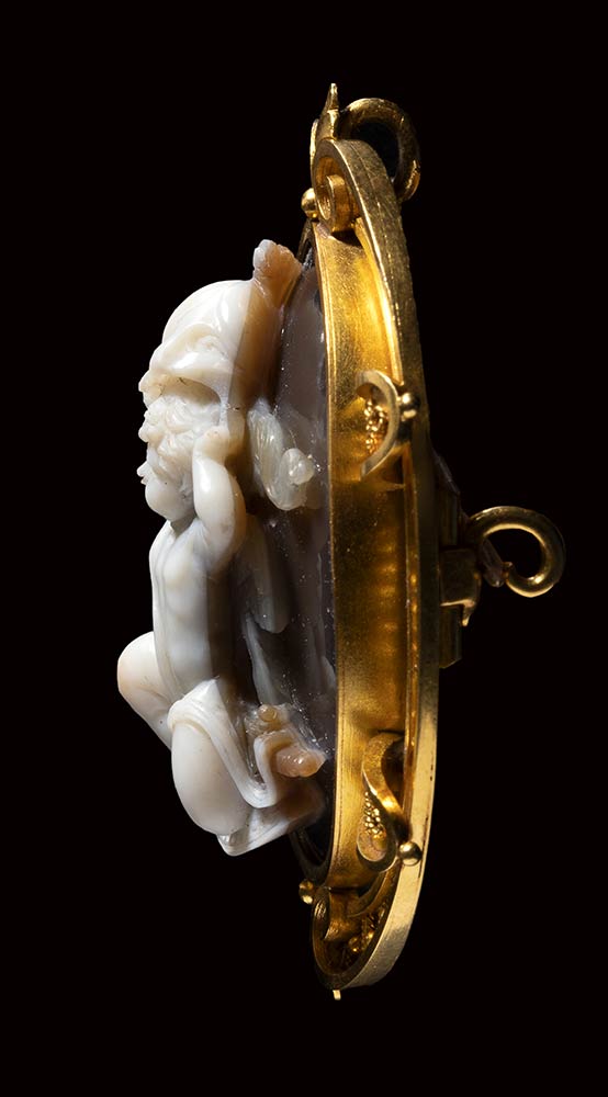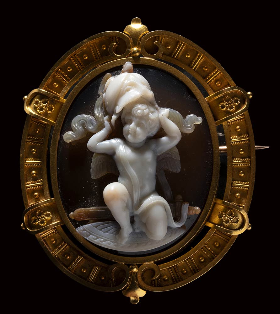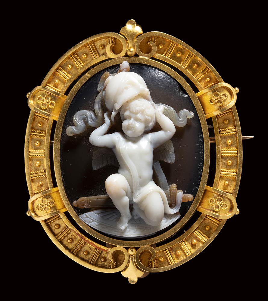 This beautiful two-layers agate cameo, signed G.A. GIRARDET, is carved with great skill and elegance in a very high-relief. Cupid, represented frontally, is wearing the helmet of Mars, too large for his tender curly-headed boy. Love plays with the weapons of the god of war. Love is preparing himself for a new love battle. The small erote holds with his arms the heavy crested helmet with, masterfully sculpted almost in the round with undercut. Cupid turns his head slightly to the left and maintains a serene and smiling air despite the effort. The figure is above the shield and rests a knee pointed on the ground as a support. Behind him, the sword, which binds to itself with the bandage attached to the scabbard. This image is highly emblematic, of great impact and beauty, engraved with skill. Slight chipping over the helmet, otherwise perfect condition. The stone is mounted in a splendid gold frame, referable to the Castellani atelier with spherical or interwoven decorations, delicately arranged in a radial pattern.