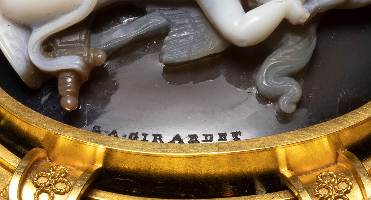 He also had a good reputation as portrait engraver: in 1874 in fact the G. is reported as «graveur de camées, spécialiste de portraits» in via Margutta, n. 53 B. In the cameos iconographic repertoire of G. (signed usually ”G.A Girardet F.”), which belonged to a now limited group of hardstones engravers still active in Rome in the second half of the 19th century, such as Tommaso Saulini, Antonio Odelli , Pietro Girometti, Giovanni Liberotti, Giovanni Dies, Paolo Neri, Carlo Civilotti, are often present, in addition to mythological subjects and motifs taken from the ancient, motifs taken from the works of modern sculptors such as Bertel Thorvaldsen.
