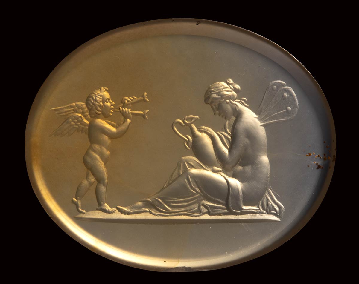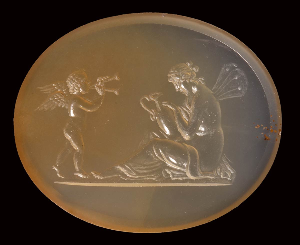 The young girl is seated on the ground, looking slightly downwards in contemplation, and in the act of holding a jug. Her delicate body is characterized by butterfly wings on the bare back, while the legs are draped. Eros advances in front of her playing the double flute. The scene was engraved with similar compositional and stylistic characteristics by Pichler (signed carnelian intaglio, Vienna Kunsthistorisches Museum, Legate Timoni n.171; sardonic intaglio, by Giovanni Pichler, Vienna, Kunst, inv. XII. 424). This composition typically reflects the neoclassical taste and it is inspired by a drawing by Angelica Kaufman after a copy from the ancient (fresco). The work is characterized by great executive finesse. Attractive honey shade of stone.