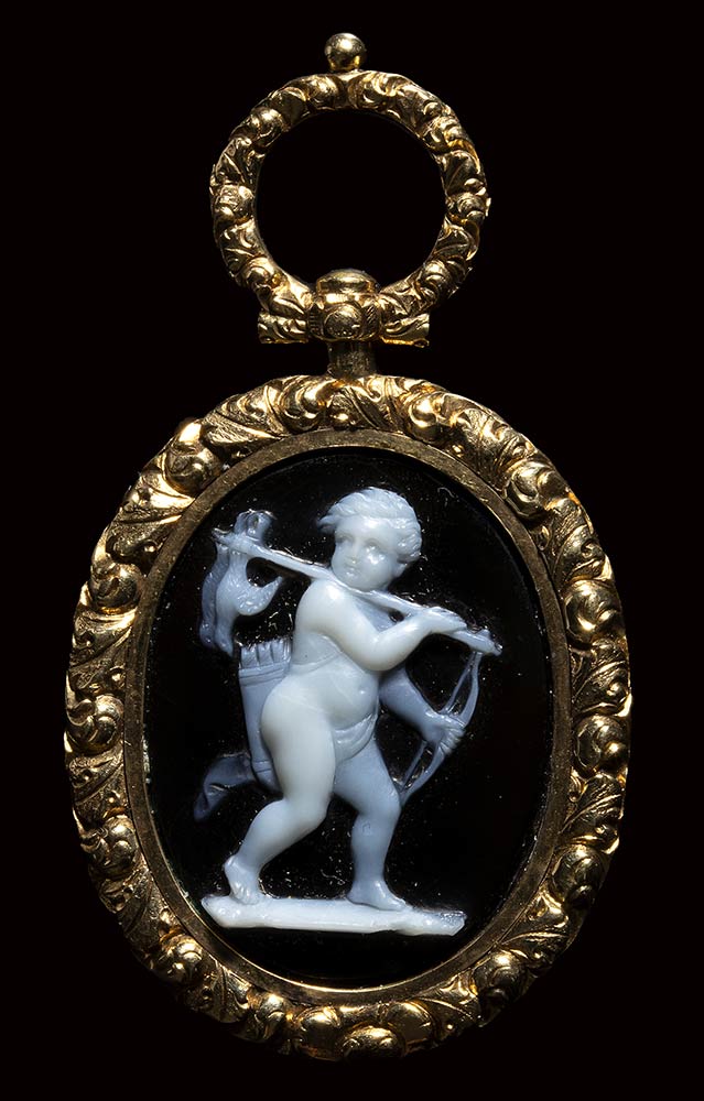 The erote advances to the right, turning his elegant head engraved in three-quarters. With the right hand he holds a stick where two prey (birds) are hung; with his left hand he holds the bow and carries the quiver tied to the bust. Groundline. This mythological subject is inspired from the ancient classical models, then spread in a more graceful key by the neocalssical artists and, above all, by the Wedgwood manufactory. The cameo is mounted on a finely chiseled gold pendant. Very fine condition.