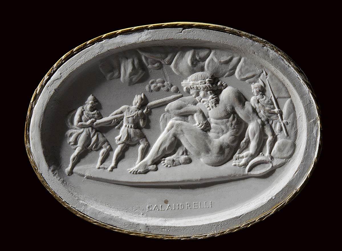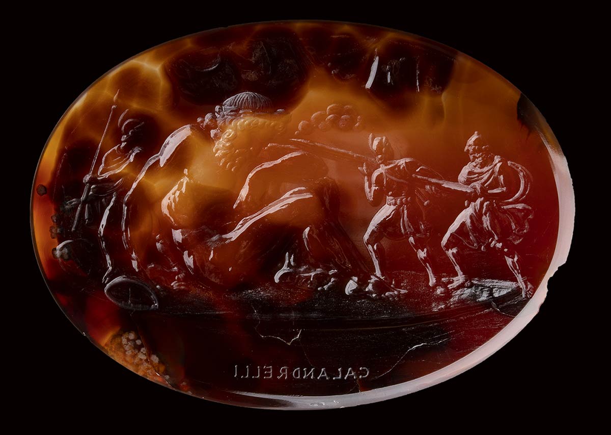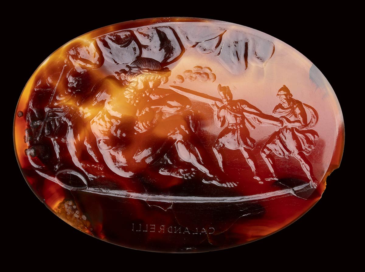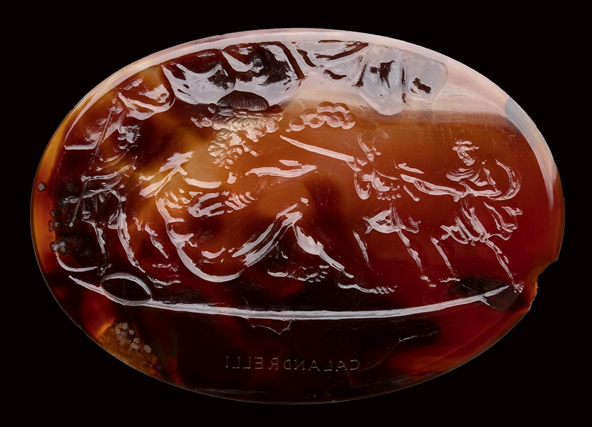 This remarkable large agate intaglio, signed below CALANDRELLI, depicts the famous scene in which