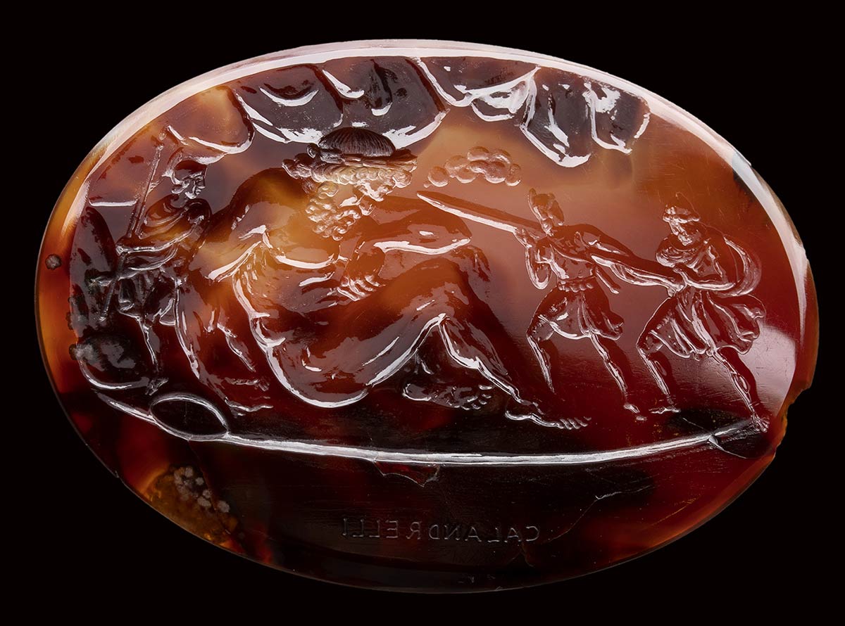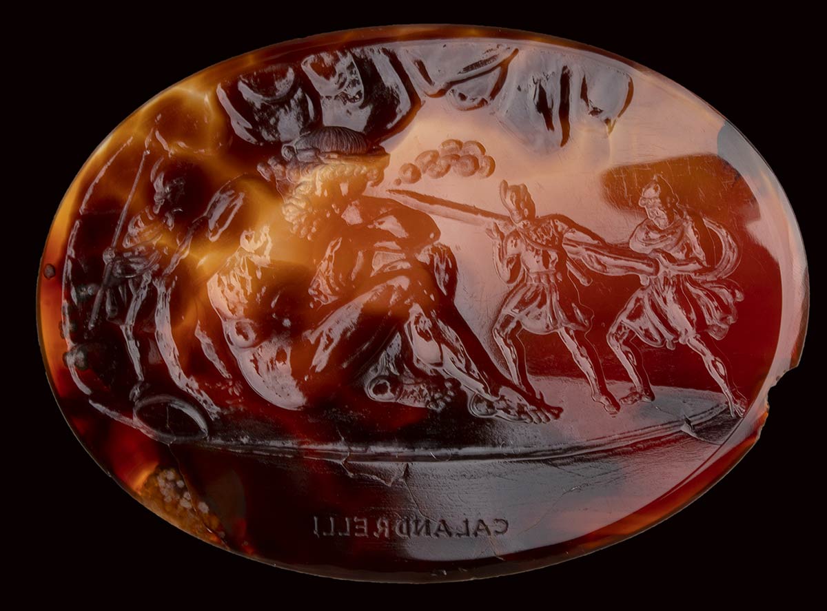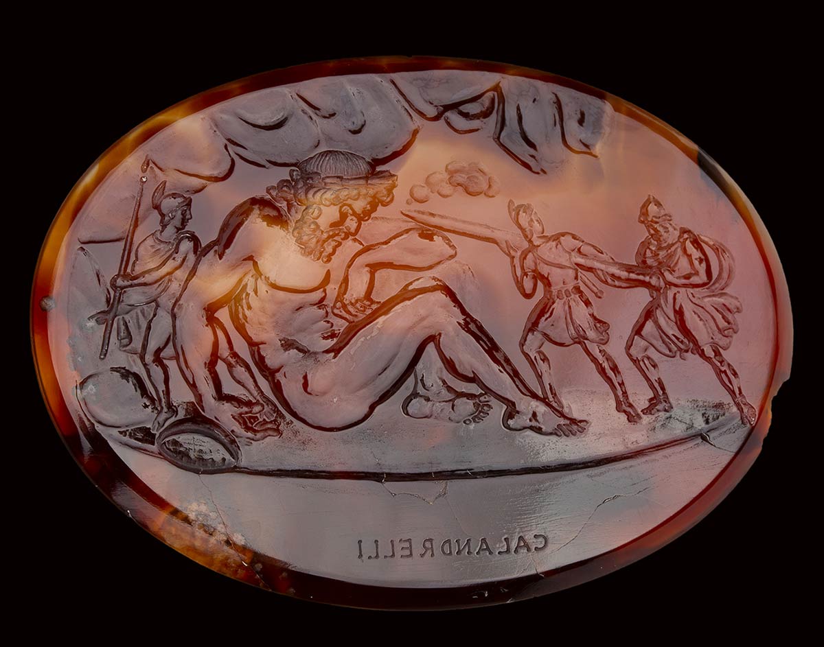 This remarkable large agate intaglio, signed below CALANDRELLI, depicts the famous scene in which
