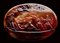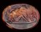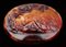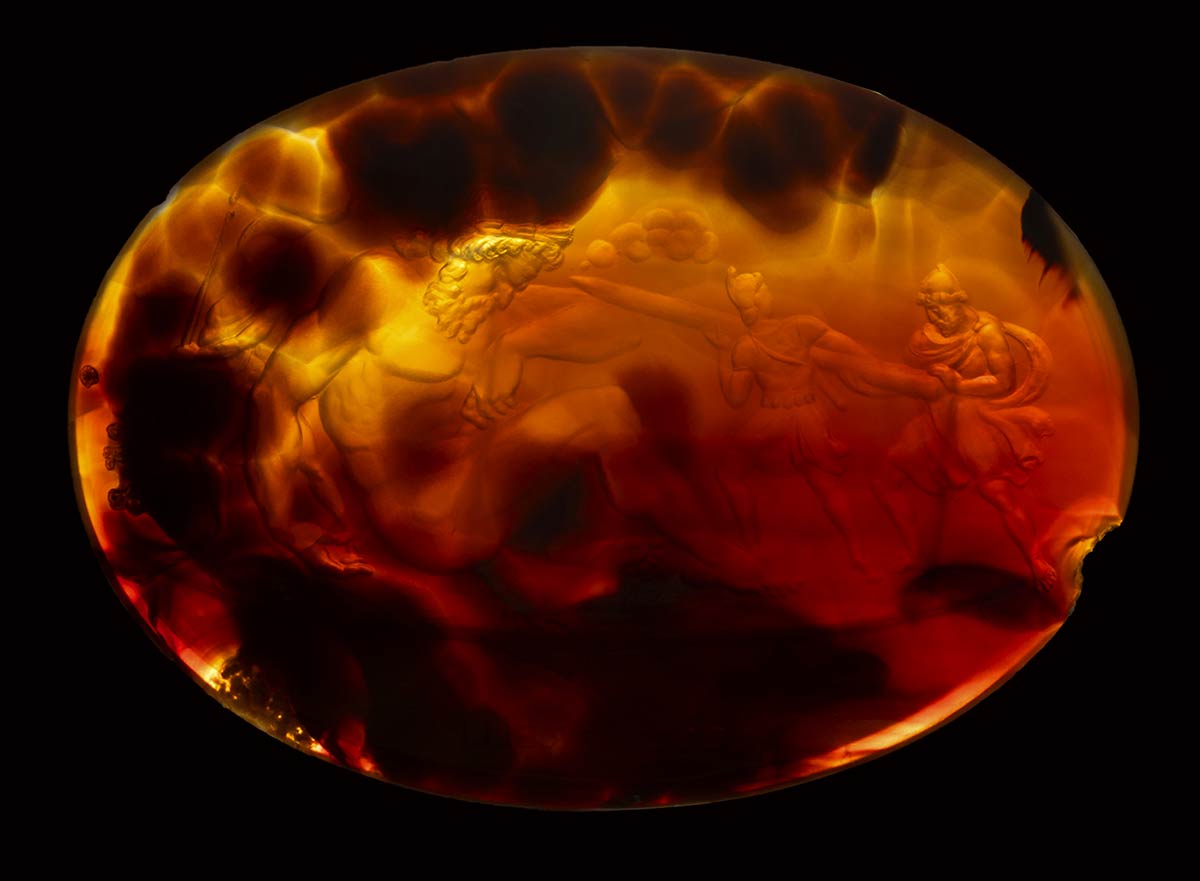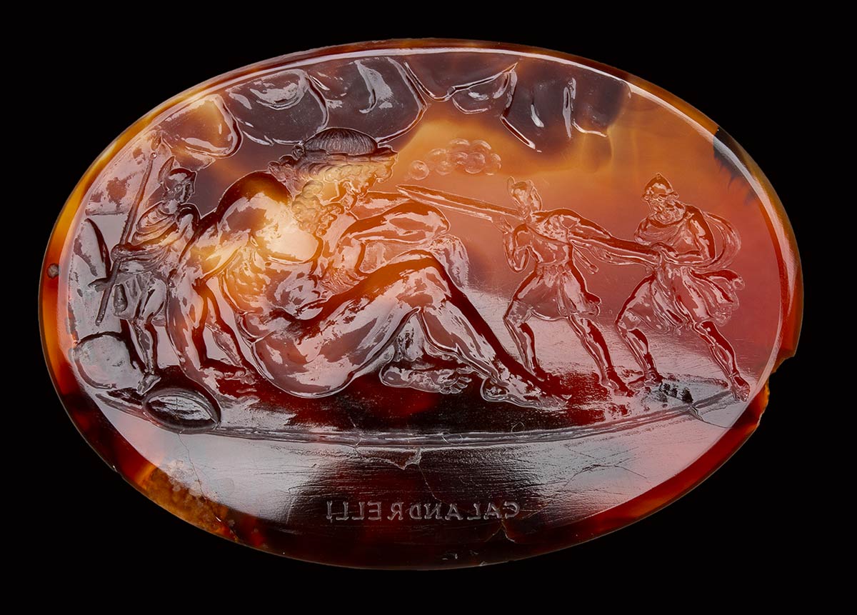The agate intaglio signed by the artist, reveals in fact an extraordinary engraving quality completely different, with a masterly rendering of the anatomical details and the expressive physiognomy of the figures very faithful to the drawing. Every detail is mirror-polished with great skill. A very rare and extraordinary agate variety was used to represent this mythological episode: the agate in fact presents very fine variety of colors from red, yellow to brown tones with shades and spots, as if to symbolize the cave, the smoke and the violence of the scene. The stone has slight signs of wear, small cracks and a chipping on the edge, probably caused by removing the stone from its original setting.