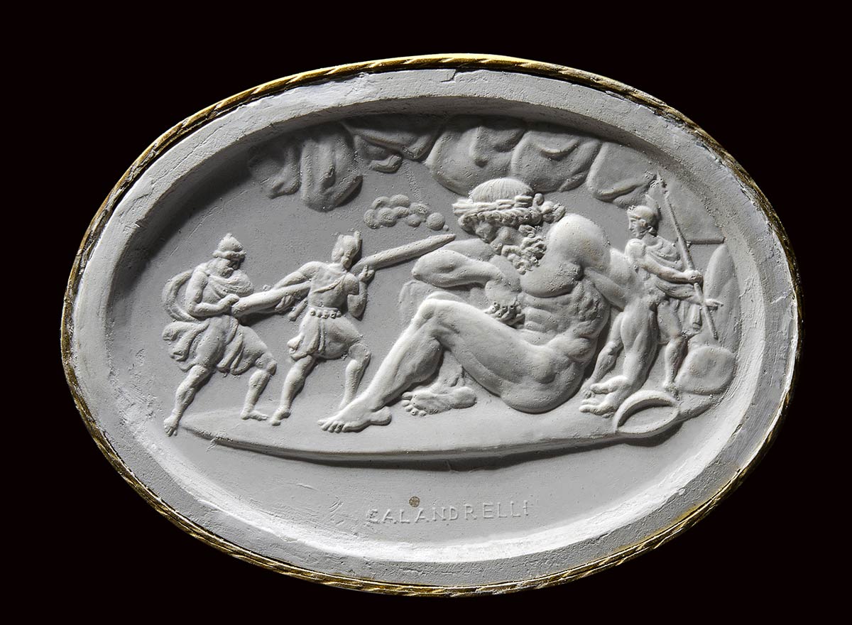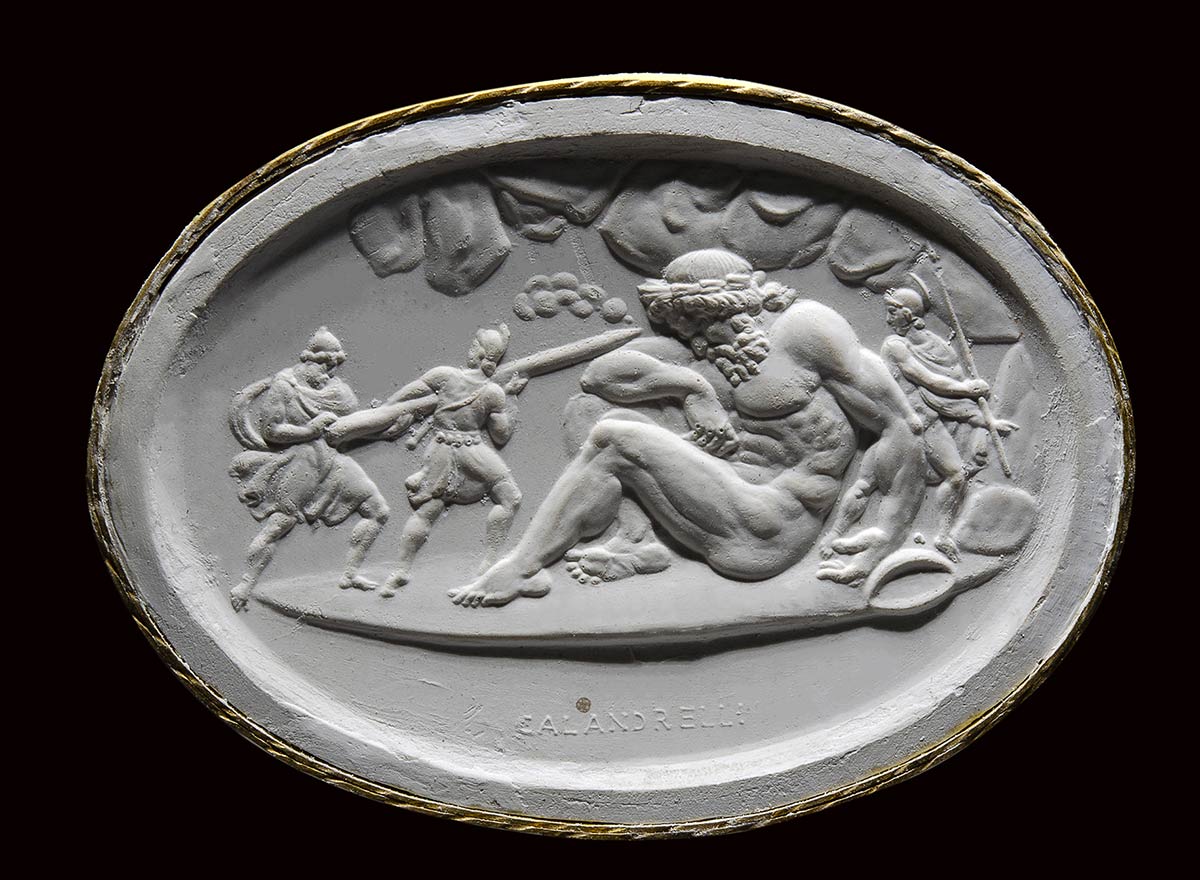 A very fine neoclassical agate intaglio signed Calandrelli. Ulysses and his companions blinding the eye of Polyphemus.