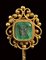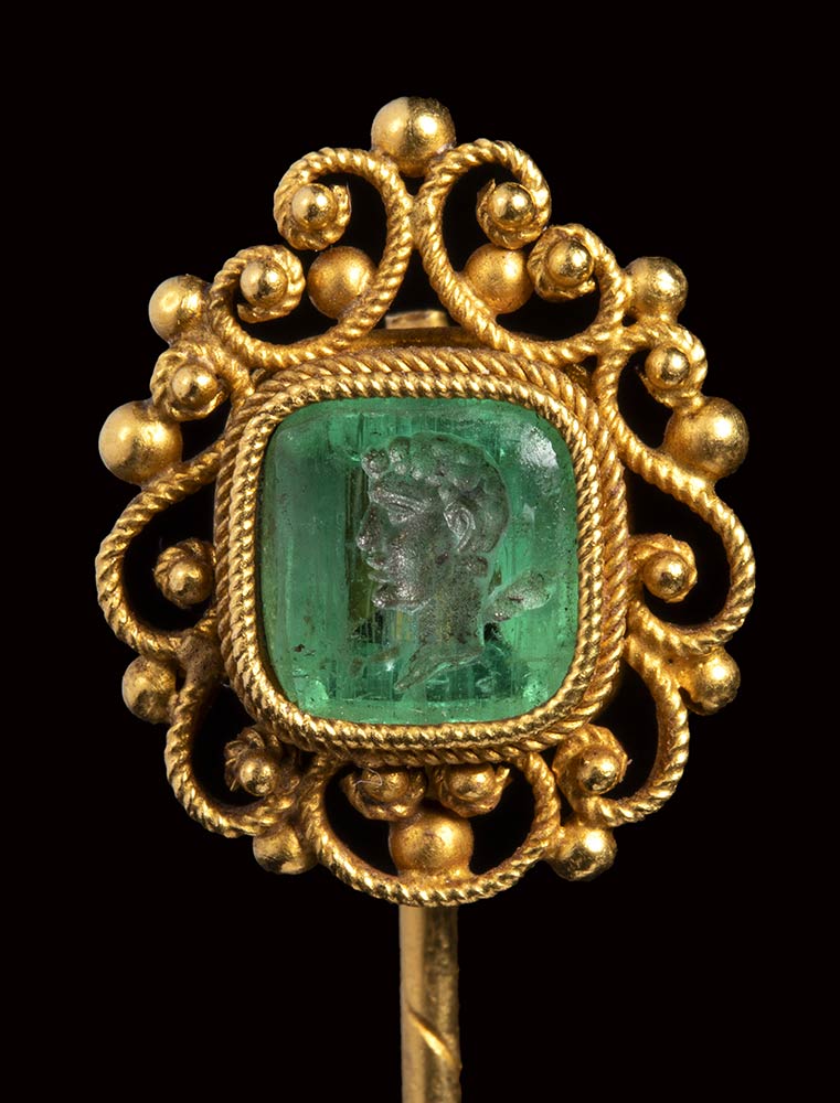 A postclassical emerald intaglio set in a gold stick pin. Bust of Hercules.