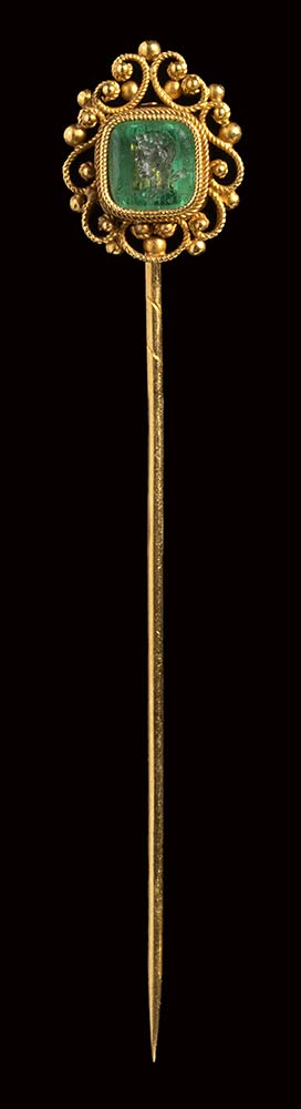 The hero is facing left, with short hair and the club on the shoulder. This precious intaglio is mounted on a fine gold stick pin characterized by a refined frame worked by intertwined and spherical elements. Very fine condition.