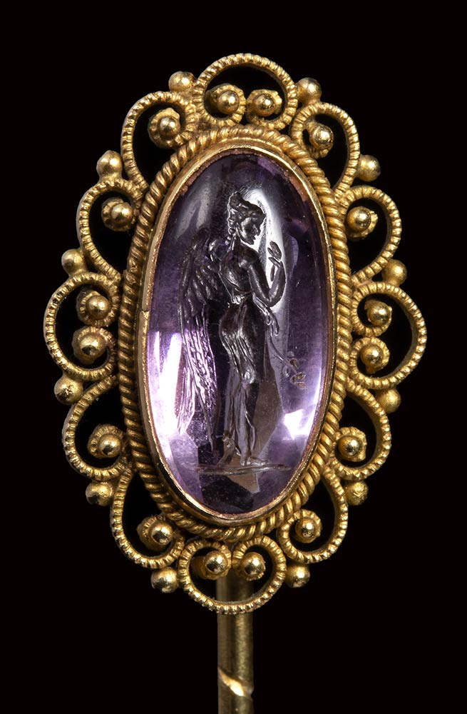 A modern amethyst intaglio set in a gold stick pin. Winged female figure.