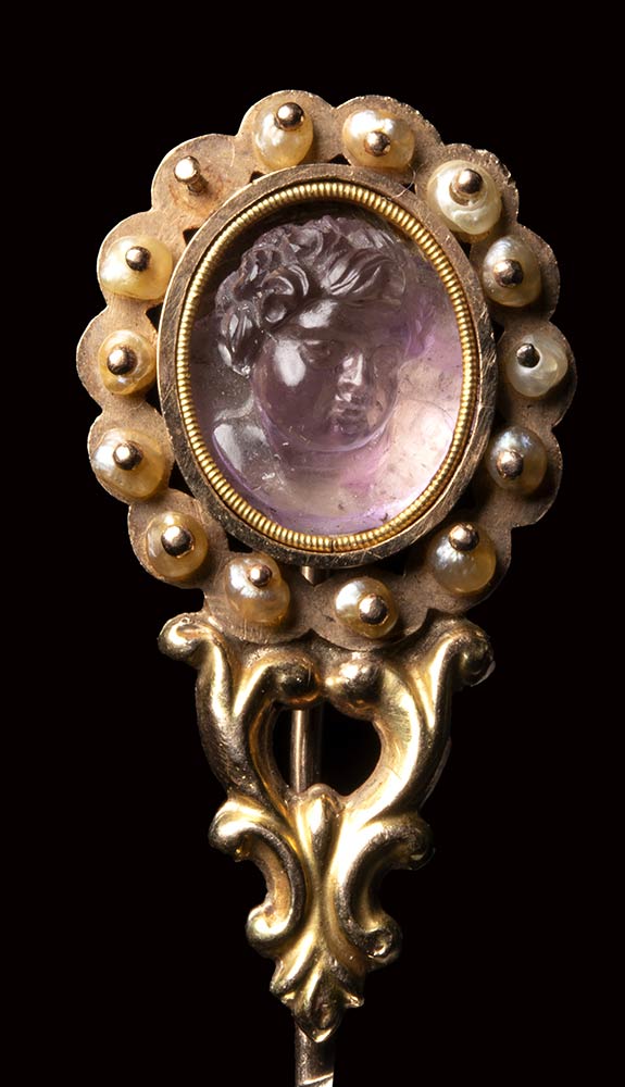 The young head is turned slightly in three-quarters to the right side, engraved in high relief. Fine work. Mirror polished. The stone is mounted on a fine gold Georgian stick pin characterized by a refined frame with pierced pearls (one missing). Very fine condition.