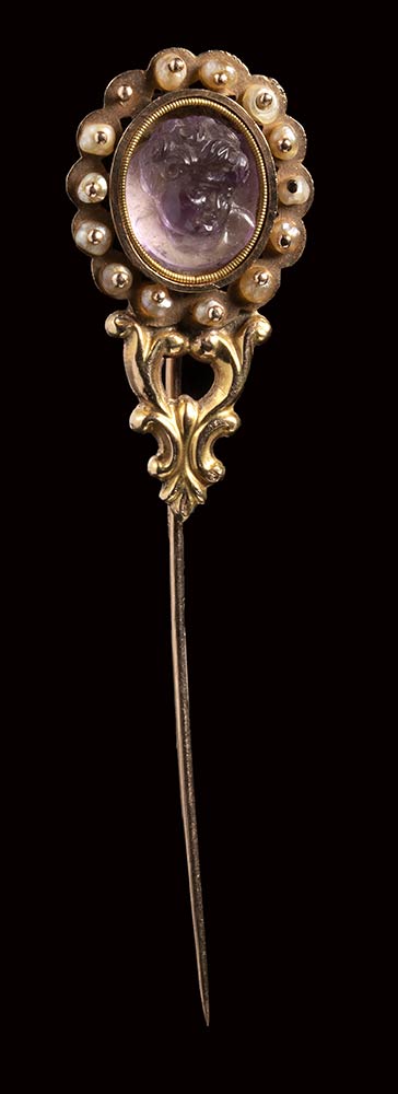 A postclassical amethyst cameo set in a gold stick pin with pearls. Bust of Cupid.