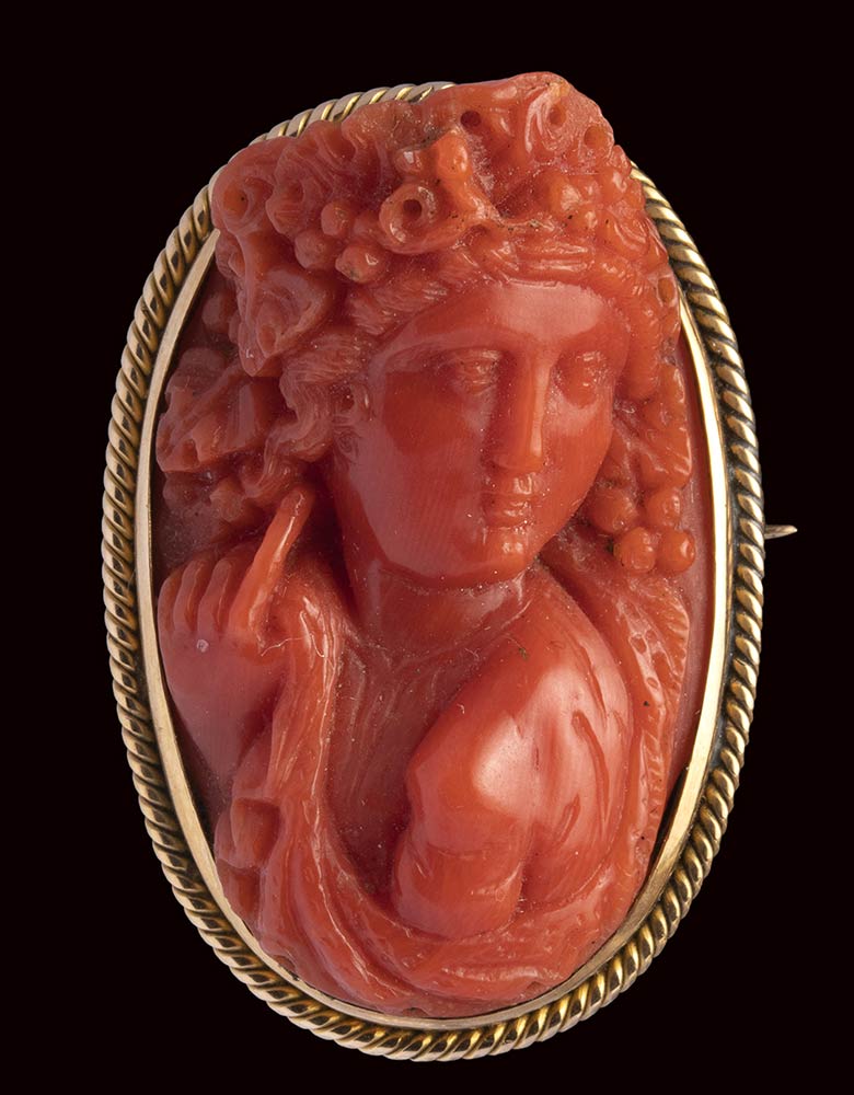 A fine Victorian coral cameo set in a gold brooch. Bacchante.