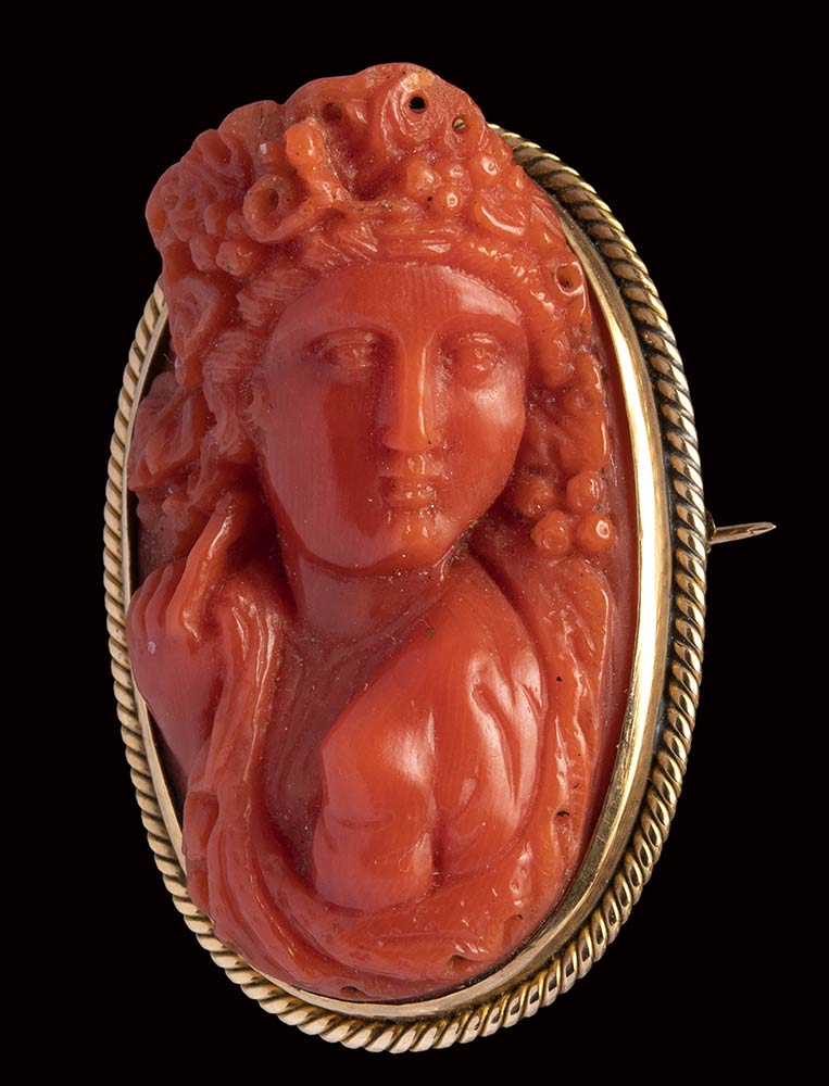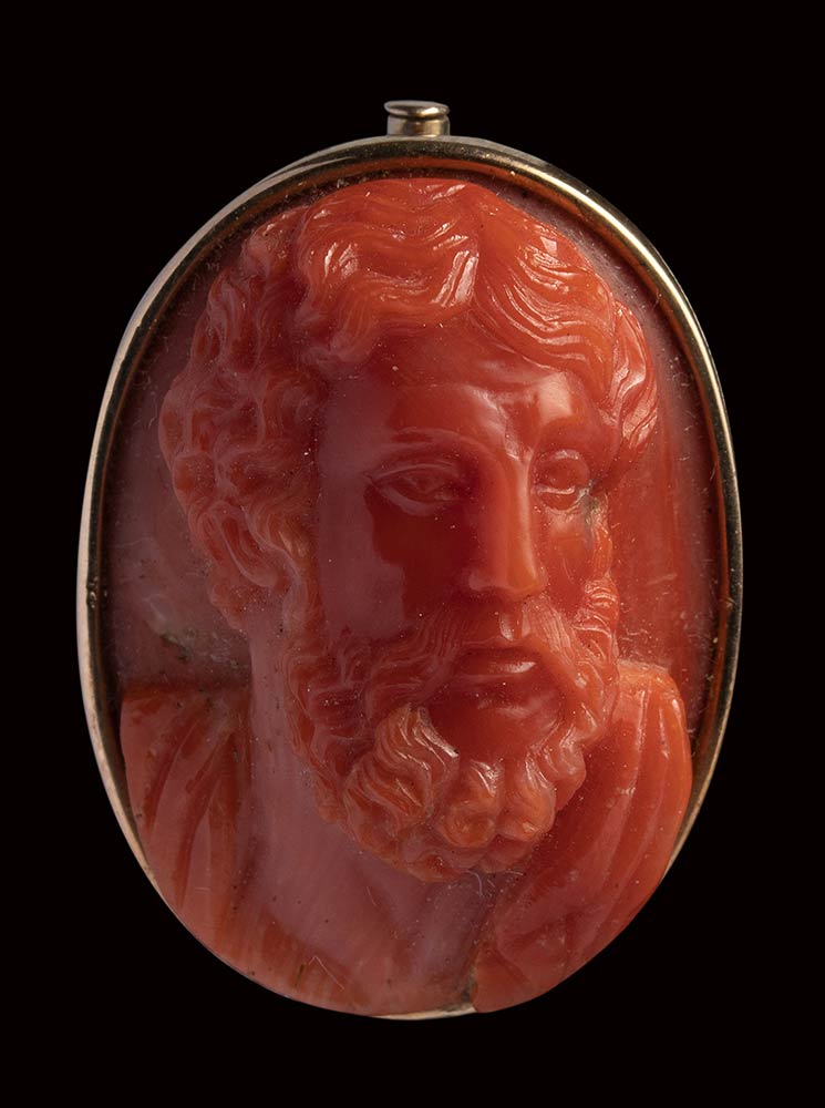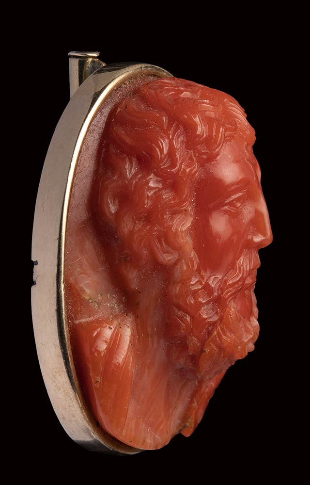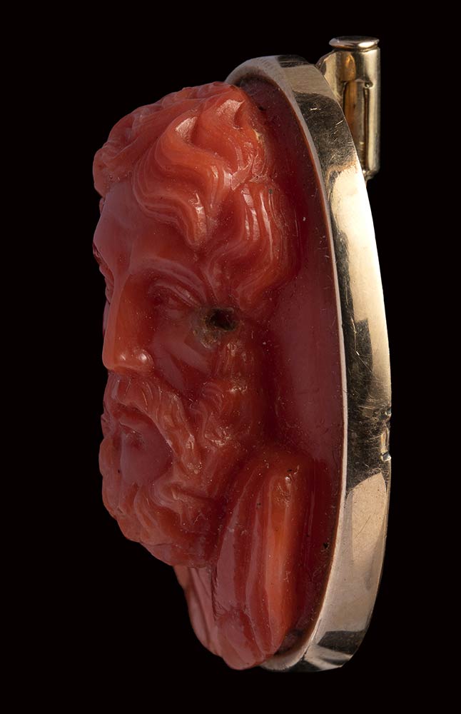 A fine neoclassical coral cameo set in a metal brooch. Bust of a bearded philosopher.