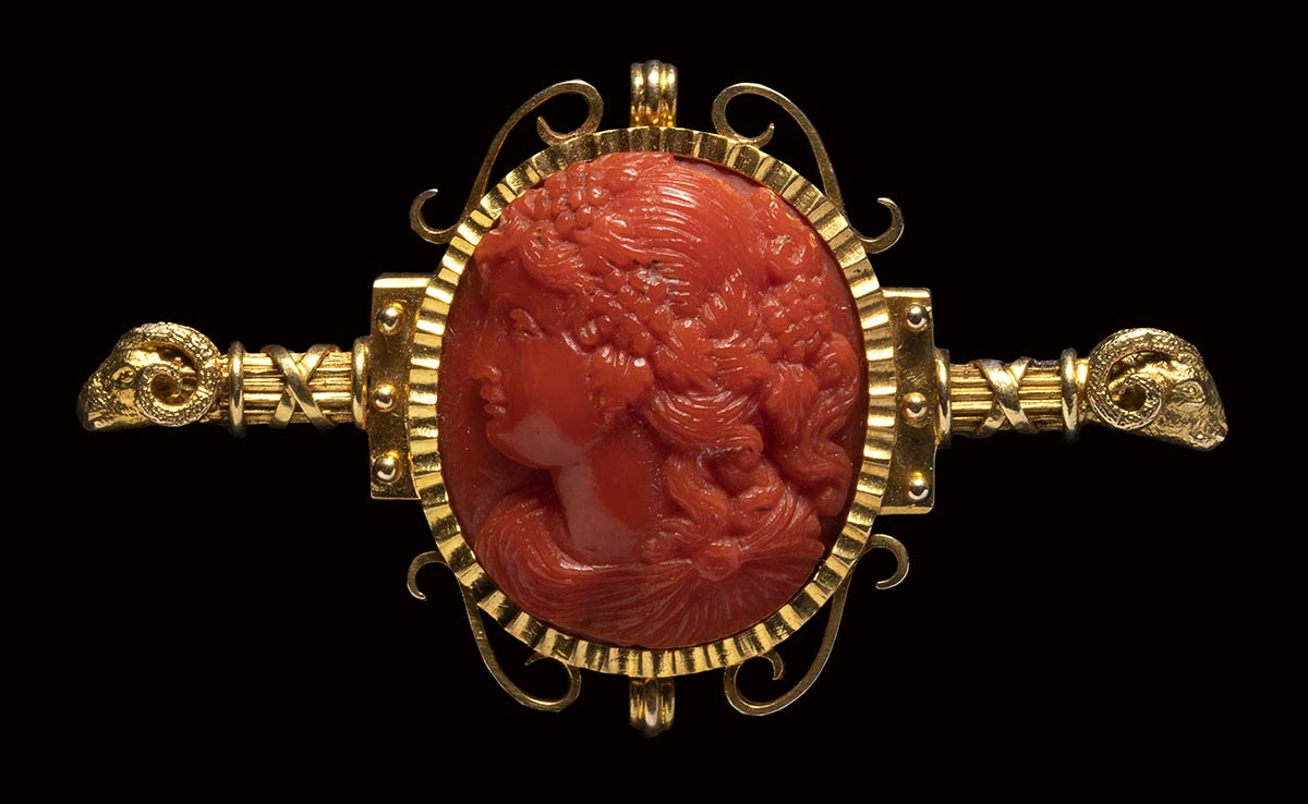 The figure is turned to the left, with the draped bust and the thick hair adorned with bunches and grape leaves. The cameo is mounted in an elegant gold brooch characterized by two protruding side parts (bundle of rods tied by ribbons), each ending with a ram head. Very fine condition.