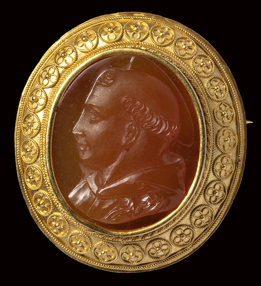 The saint is turned to the left, wears his typical robe and nimbus on his head. The cameo, finely engraved on a vivid red carnelian, is mounted in an elegant gold brooch adorned with stylized floral patterns on the frame. Very fine condition.
