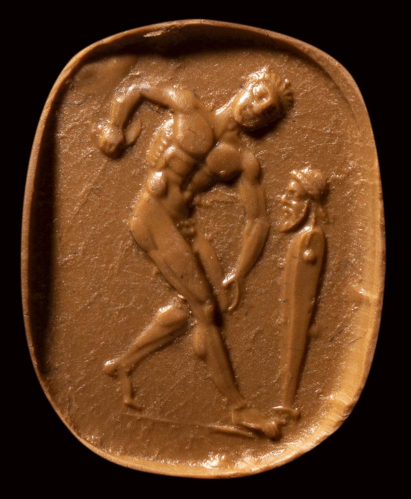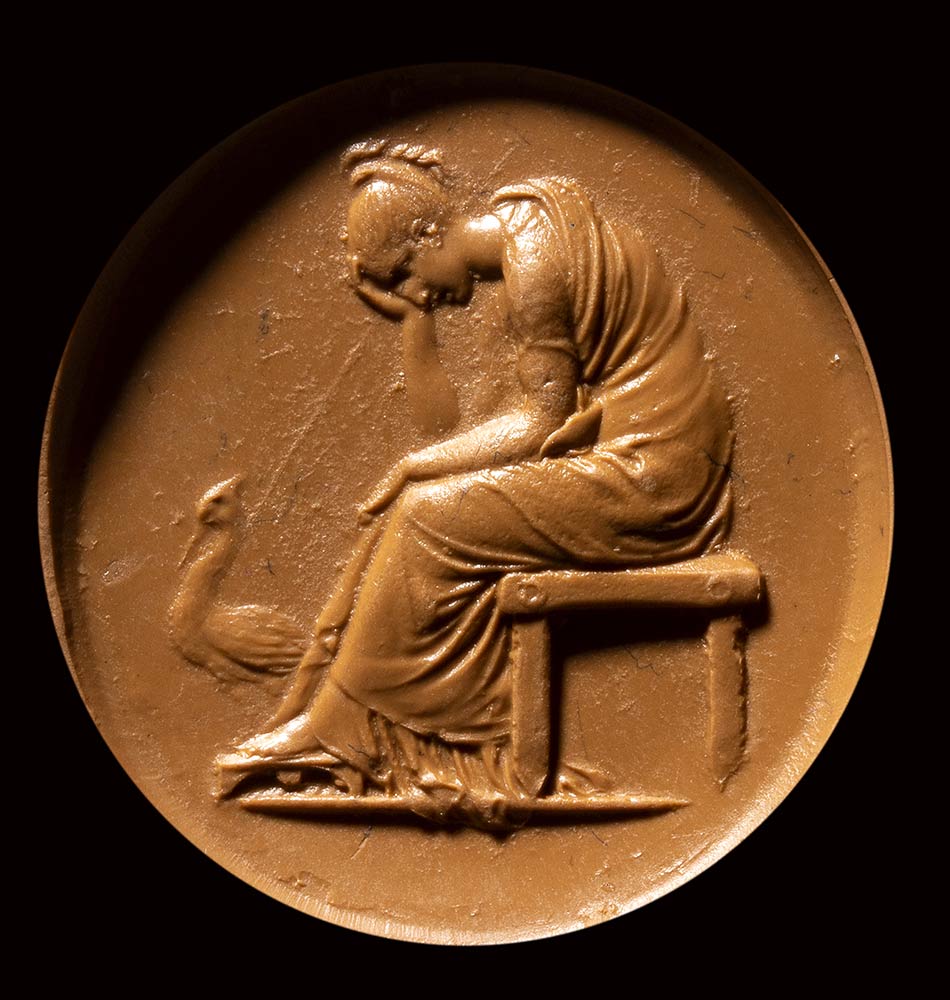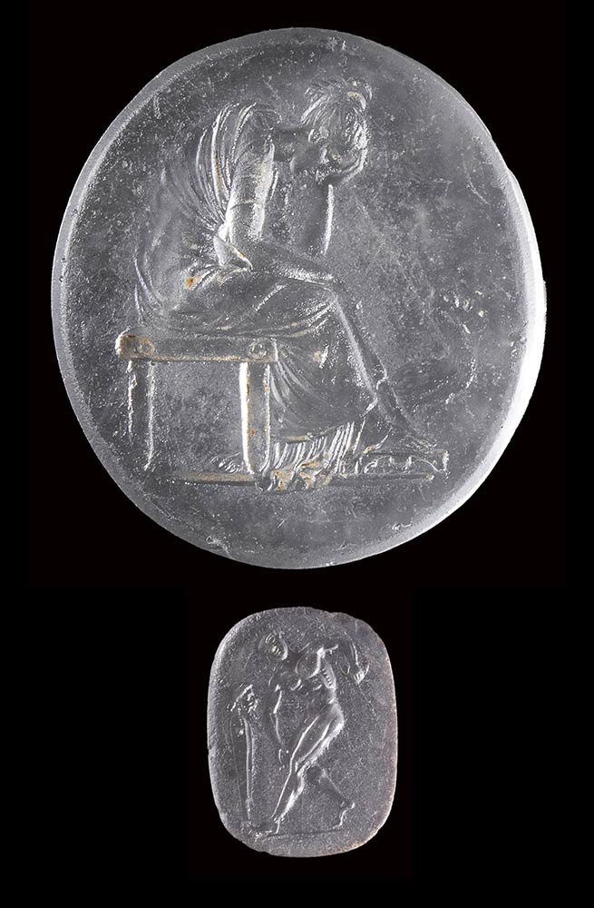 The seated female figure is inspired by a marble stele sculpted by Antonio Canova for the prince Guglielmo d'Orange Nassau (1806-1808) in Padova - Eremitani until 1896. The impression is taken from a carnelian intaglio engraved by Pichler. Wear marks. / Discobolus. The cast is drawn from a carnelian intaglio, British Museum, coll. Cracherode (1799), mentioned in the Paoletti repertoire as "Un giuocatore al Disco". The specimen, finely detailed, has been polished (the engraved figure) and mounted in a ring at that time; afterwards it was unmounted. Light wear marks.