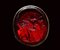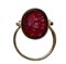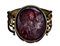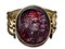 The hoop composed with 4 rounded gold wires saldered together, the terminals in a rectangular shape with a serrated frieze, the hole fixed to a swivel gold box by two screws. The oval-shaped frame is set with a dark red glass impression: two conjoined classical portraits to be identified; at the left a bearded shortten hair man, at the right, a woman with soft hair and a large lock. Wear marks.