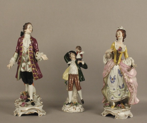 Firmato, datato. Tre statuine in porcellana Capodimonte raff. ''PERSONAGGI''. XX secolo. Difetti. Mis. Alt. cm 28 e cm 22.