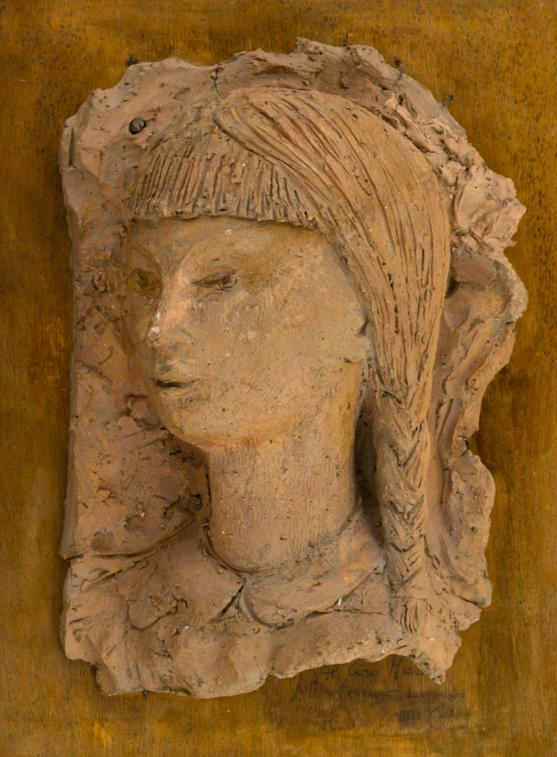 Otello Pucci Testa di ragazza Terracotta, cm. 32x22x7, su base di legno, cm. 40x30 Firma e dedica a persona in basso a destra.