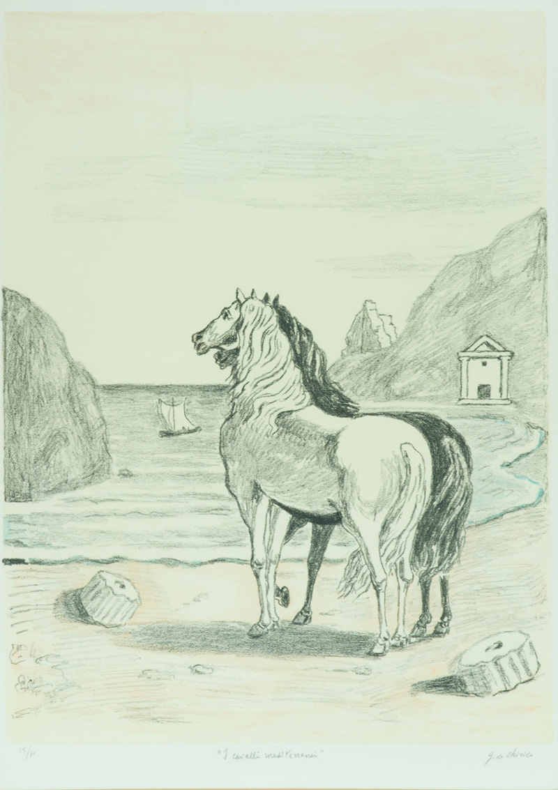 Giorgio De Chirico I cavalli Mediterranei Litografia su carta, cm. 70x50, es. 15/80 Firma dell'Artista e timbro a secco "Alberto Caprini stampatore in Roma", in basso a destra, tiratura e timbro a secco dell'Artista in basso a sinistra, titolo in basso al centro.
