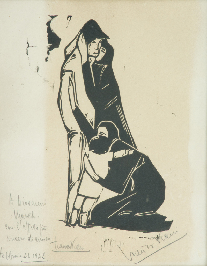 Lorenzo Viani Il ritorno Xilografia, cm. 27x18, su carta di cm. 35x27 Firma in basso a destra, dedica a persona datata 1942 in basso a sinistra.