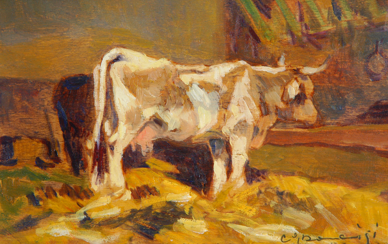 Carlo Domenici Mucca alla greppia, metà anni '20 Olio su tavola, cm. 12,2x19,6 Firmato a matita nel colore in basso a destra. Bibliografia: Paolo Fabiani, "Carlo Domenici" pag. 108.