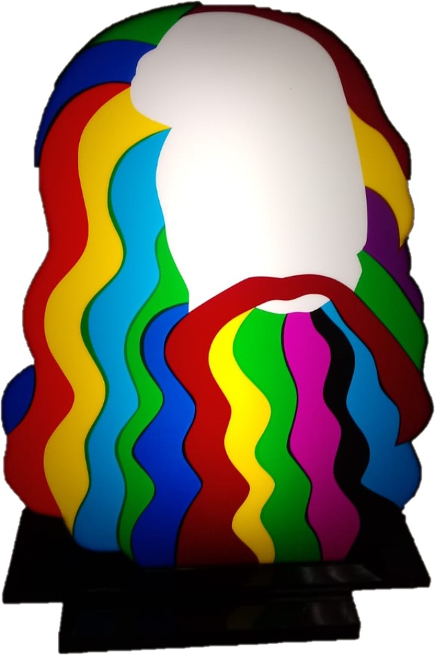Marco Lodola (Dorno 1955) “Leonardo” 2000 scultura, installazione luminosa plexiglass e neon cm 53x40x17 firma e titolo alla base, opera accompagnata da autentica su fotografia del Maestro