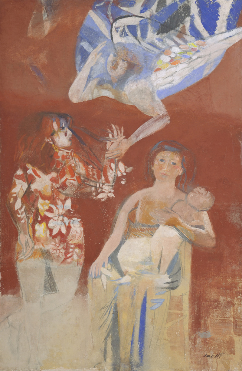 Bruno Saetti Colloquio con l'angelo, 1974 Affresco su tela, cm. 205x135 Firmato in basso a destra. Sul verso: firma, data e titolo; Etichetta: "Galleria San Fedele", Milano con descrizione; Cartiglio: "Galleria d'Arte Moderna", Bologna, con descrizione e timbro "Antologica Bruno Saetti, Museo Civico Bologna, 23 Novembre 31 Dicembre 1974, Galleria Comunale d'Arte Moderna". Certificato di Provenienza "Galleria d'Arte Palazzo Vecchio", Firenze, su foto.