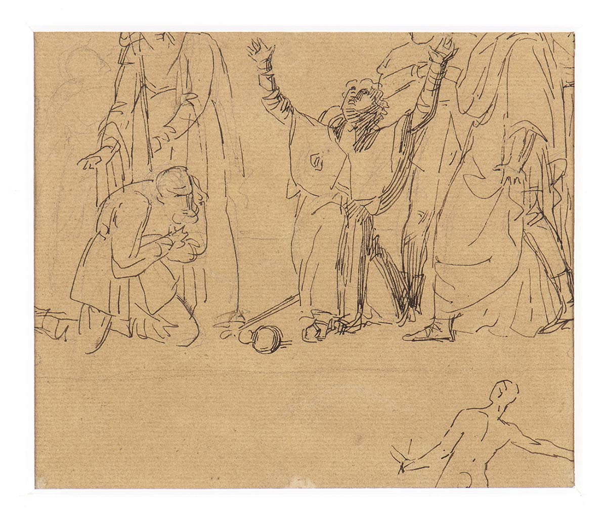 Reca al retro disegno a penna raffigurante Gruppo di figure in adorazione.