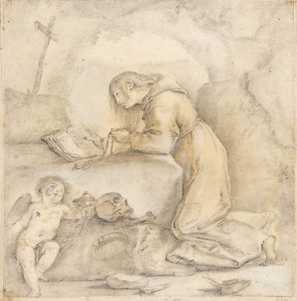 Maddalena penitente con saio e cilicio medita sulla passione di Cristo